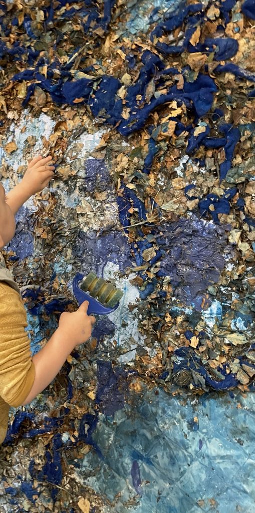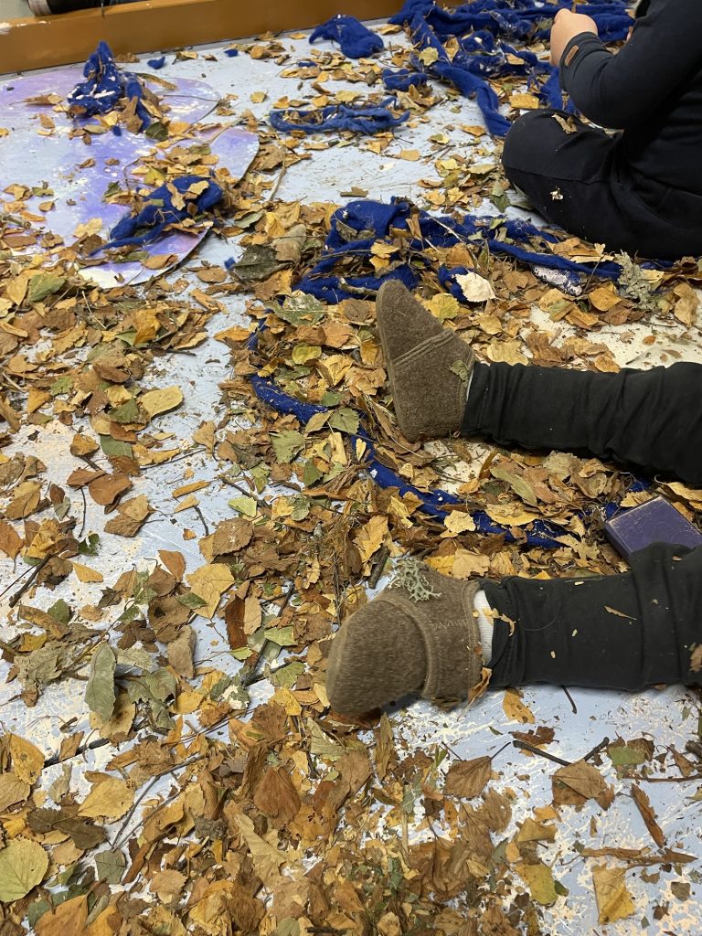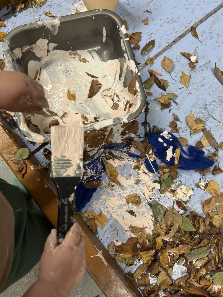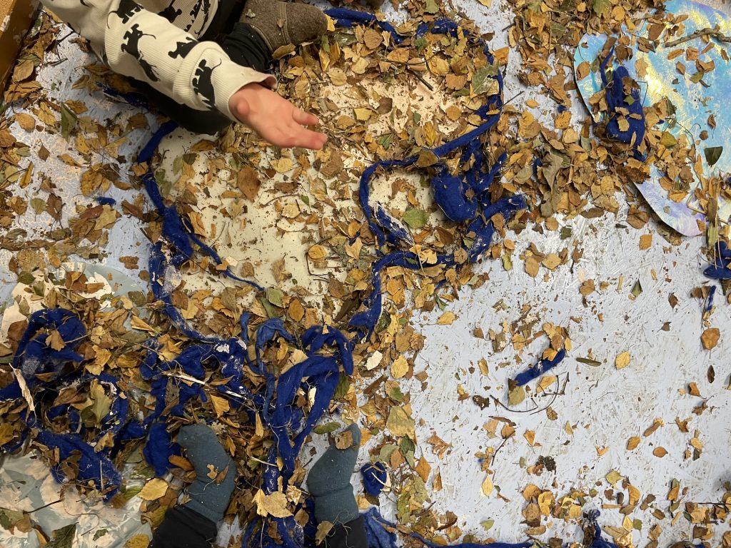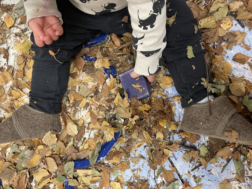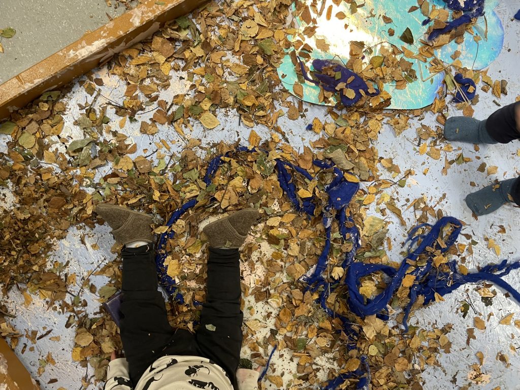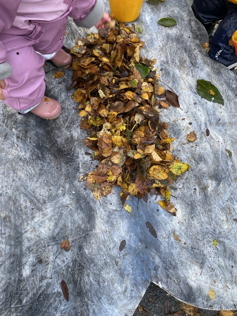 Når vi maler på bladene kan vi oppleve at det gir oss motstand og frustrasjon, mens når vi maler på en flat tekstur der penselen flyter over, kjenner vi at det blir enklere for oss. Når vi leker med bladene ute blir det å samle og putte som driver oss.