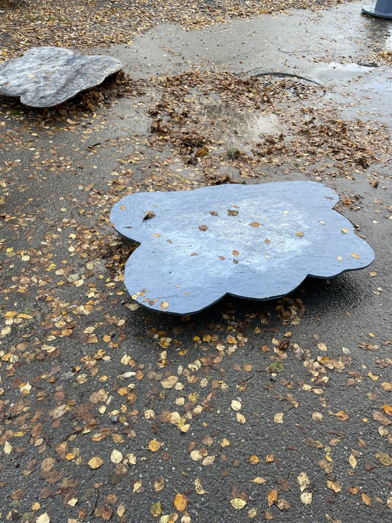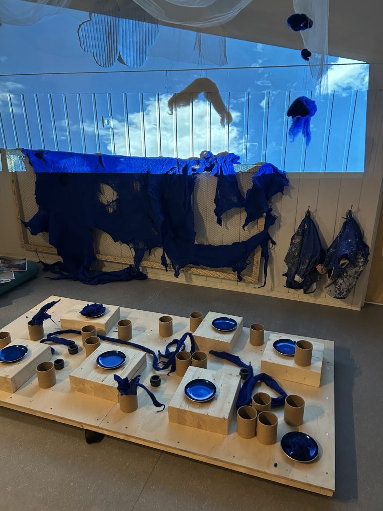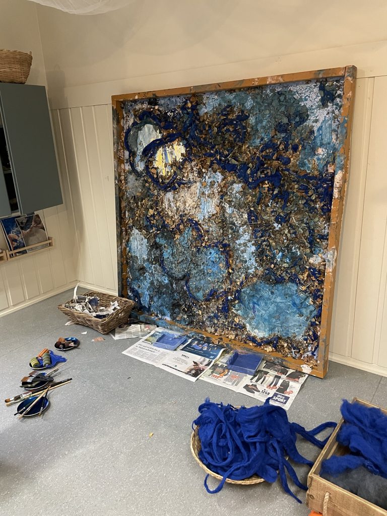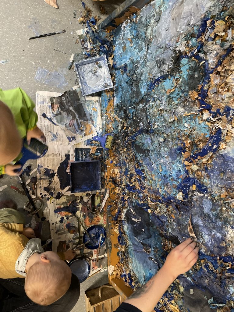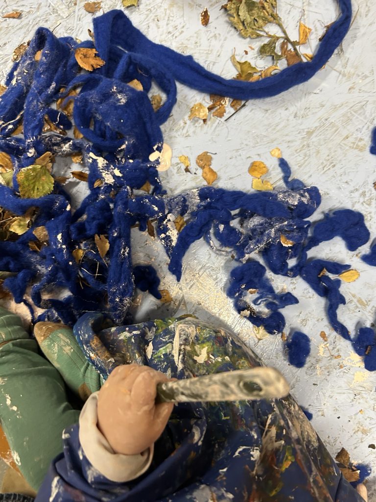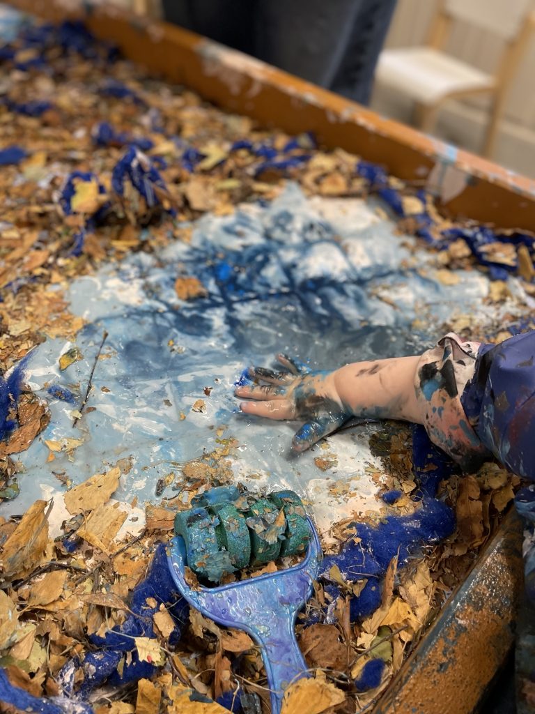 Inne har vi forberedt en ramme der ulla vi har bearbeidet er med på å forme skyer. Vi bruker blader fra uterommet til å skape tekstur i skyene. Vi sitter i bilderammen omkranset av de tørre bladene som knuses i hendene og trampes på. Malingen og vannet blandes – og håndflatene settes i arbeid. Vi veksler mellom ulike arbeidsflater – noen ganger jobber vi på en liggende flate, der hele kroppen er oppi rammen, mens andre ganger arbeider vi på en stående flate hvor vi kan strekke oss opp og bøye oss ned.