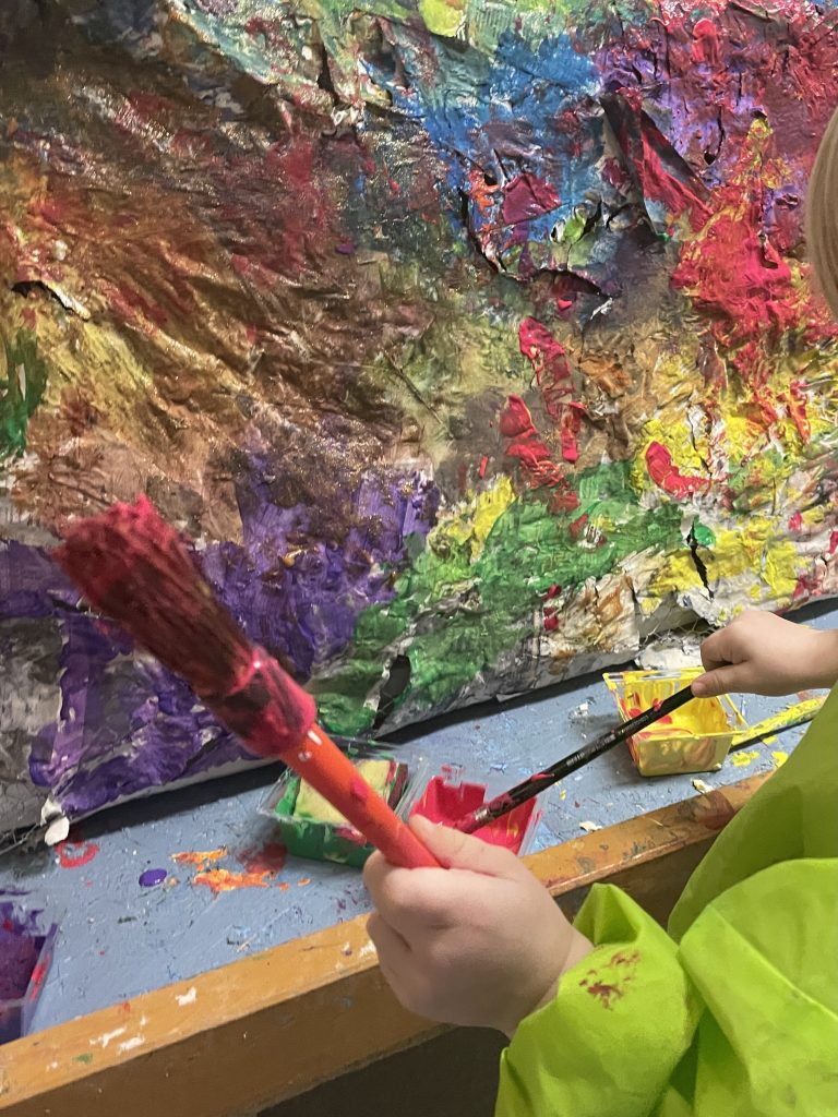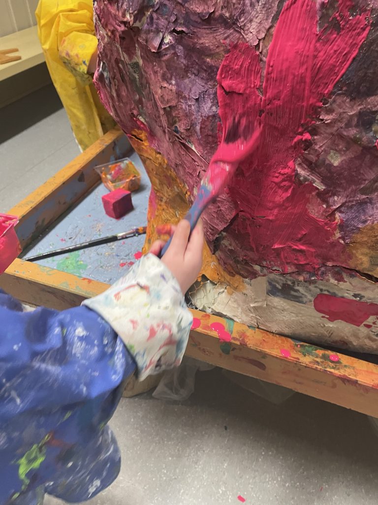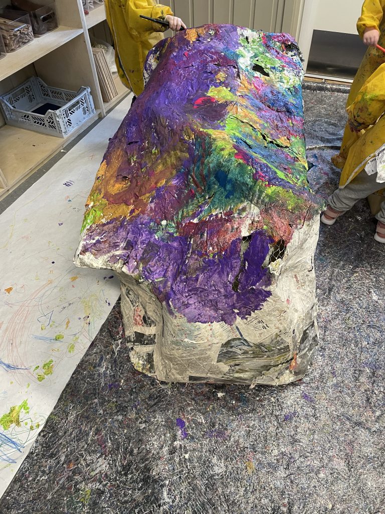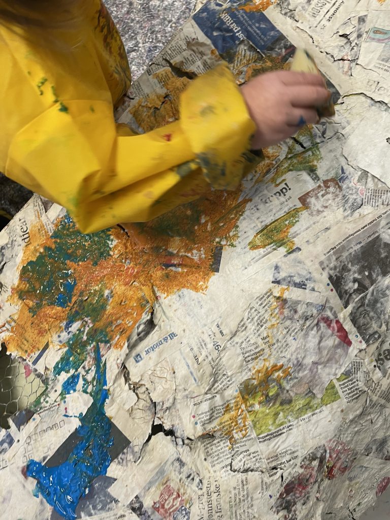 Under tomåltidet en dag prater vi om den store skya, og hvilke farger vi har malt den i, og et av barna sier: «Vi pynta skya til fest!»