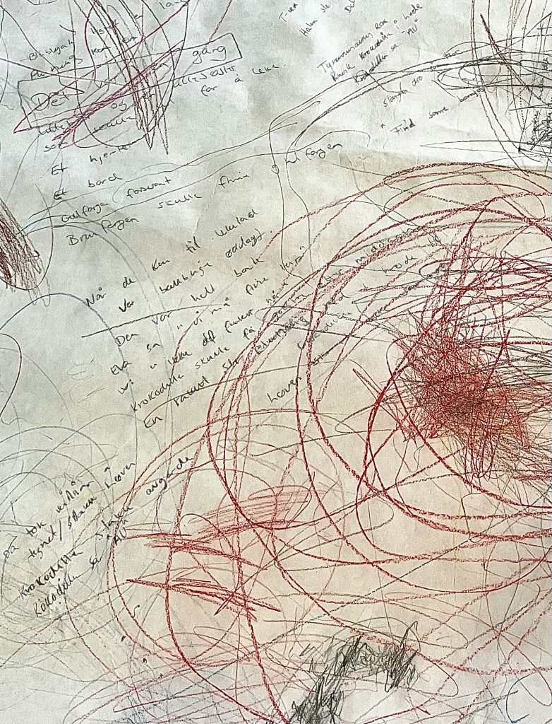 ‘Blyantene går i bevegelse rundt på arket, praten går imens skribleriene, sirklene og strekene fortsetter. Flere farger kommer på arket. Pedagogen tar tak i en grå blyant og skriver ned setningen «Det var en gang». Ordene sies høyt samtidig som tradisjonssetningen blir skrevet ned.