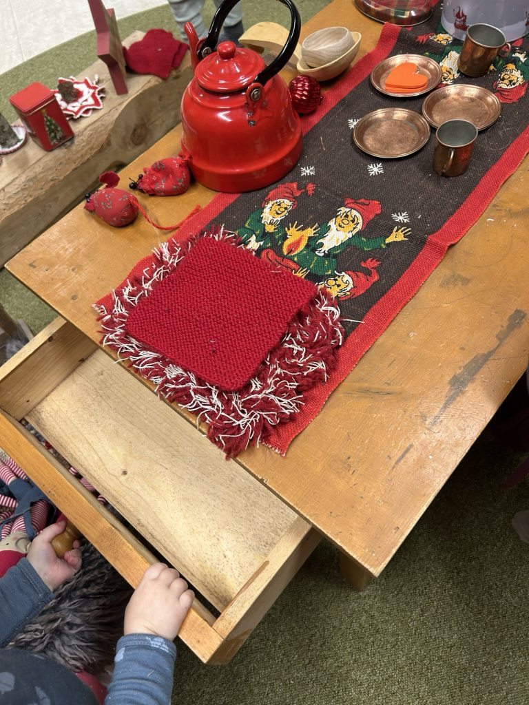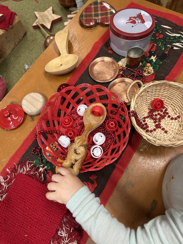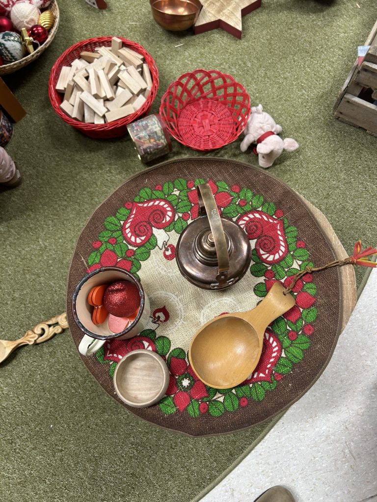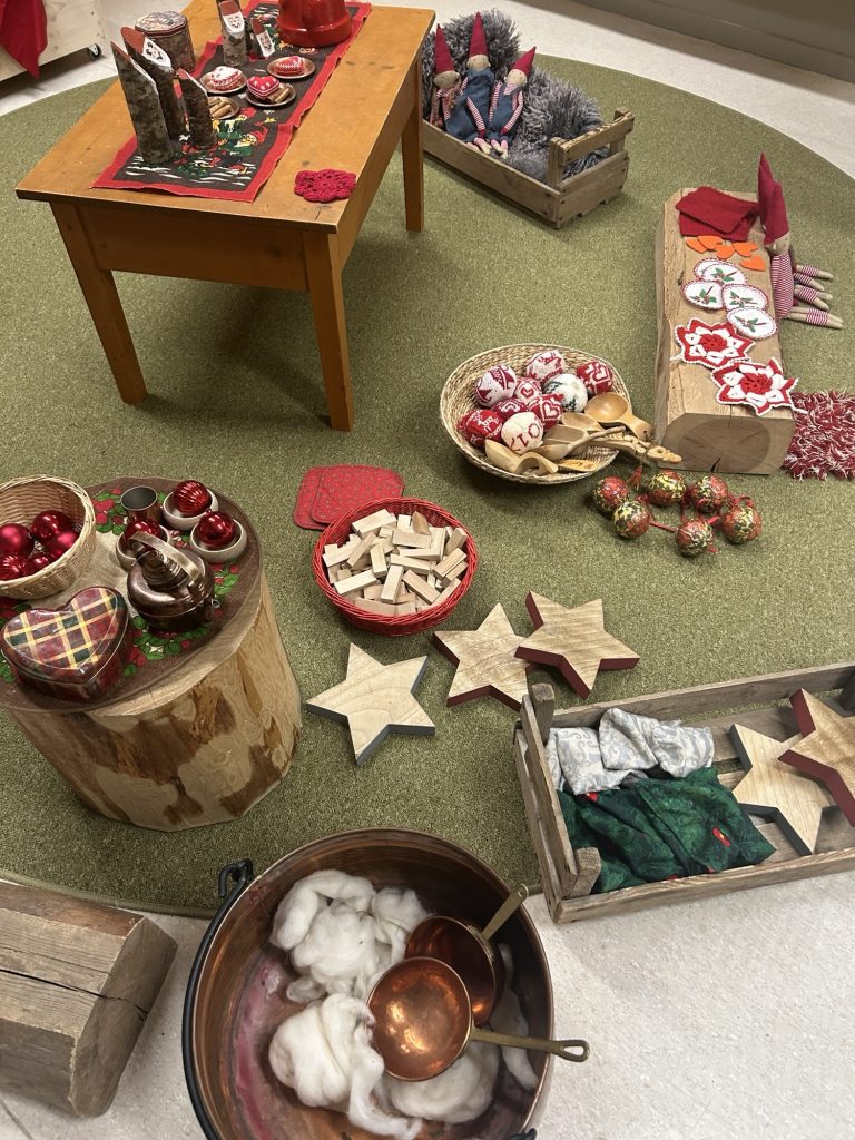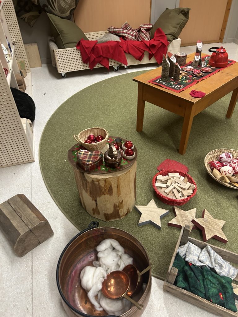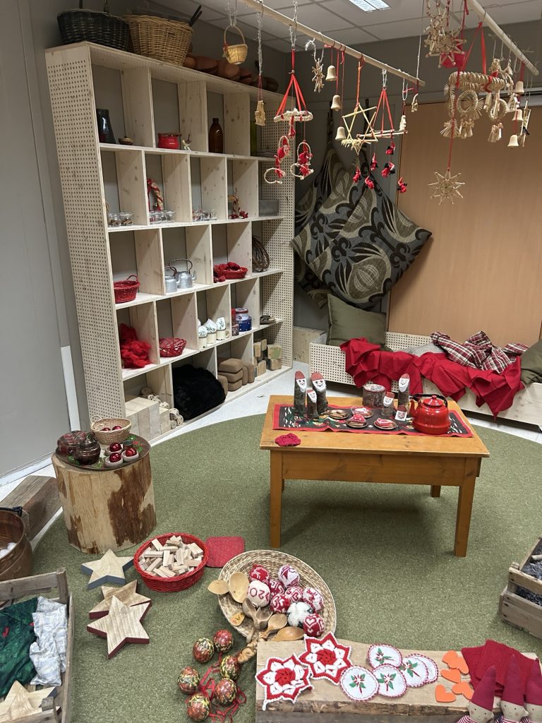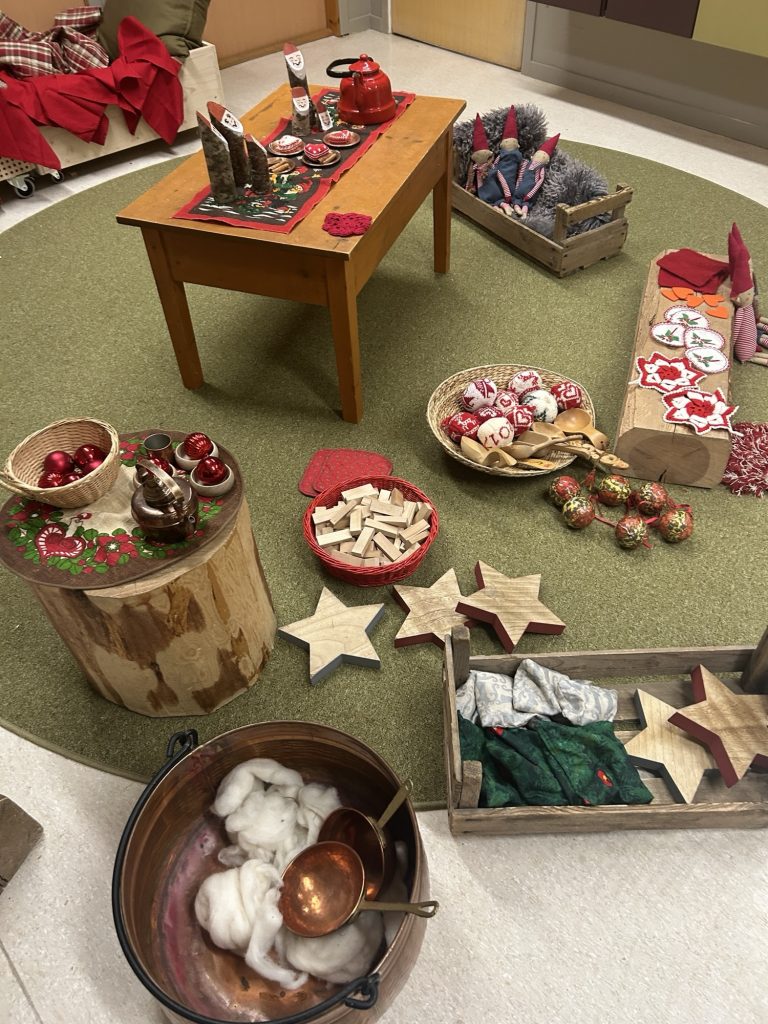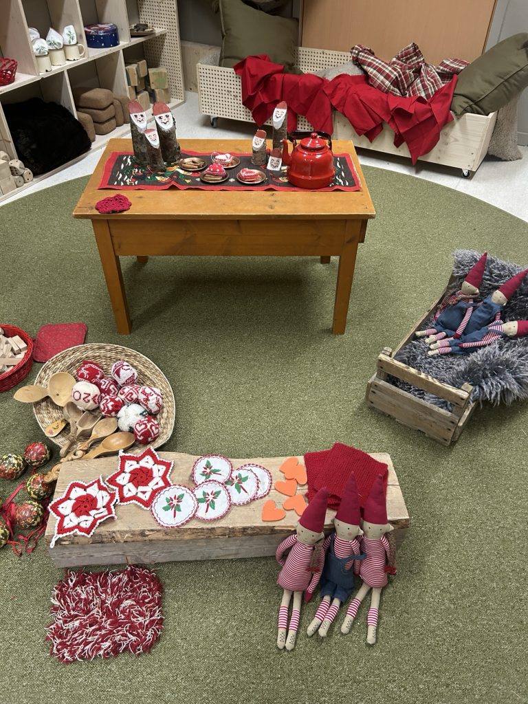 Kjøkkenet vårt ligger mellom ettåringen-og toåringenes avdeling. Desember nærmer seg og vi forandrer i rommet med materialer som passer til tiden. Lekemiljøet er dekket for undring, utforskning, spørsmål og å være sammen. Materialer er i forskjellige farger, former og teksturer og nok til alle som vil delta.