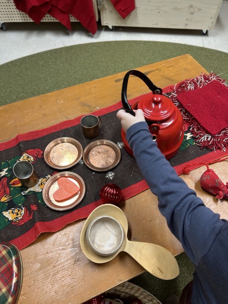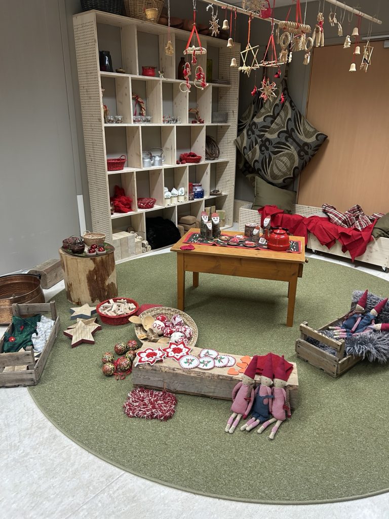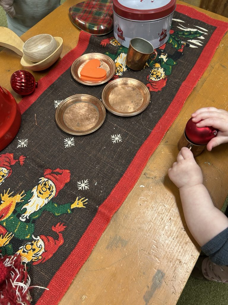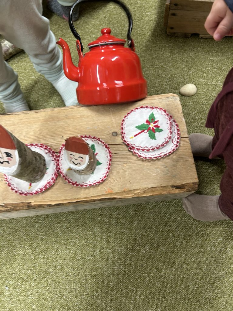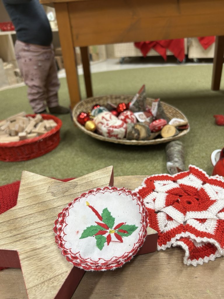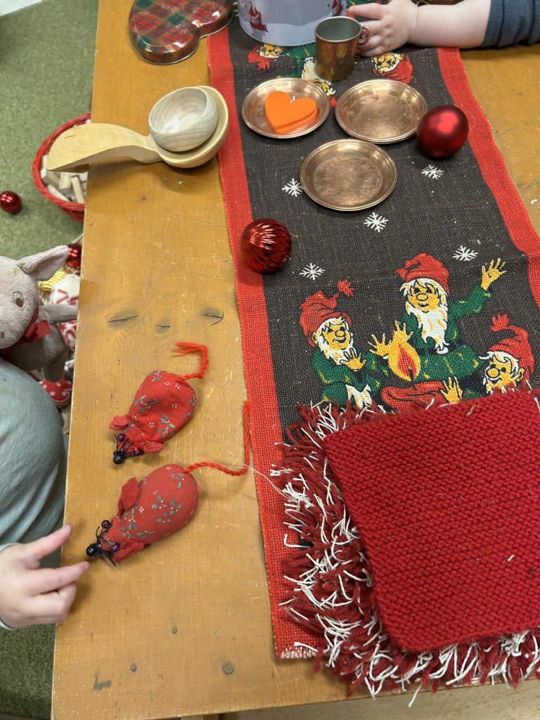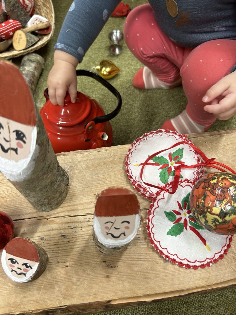 Kjøkkenet vårt ligger mellom ettåringen-og toåringenes avdeling. Desember nærmer seg og vi forandrer i rommet med materialer som passer til tiden. Lekemiljøet er dekket for undring, utforskning, spørsmål og å være sammen. Materialer er i forskjellige farger, former og teksturer og nok til alle som vil delta.