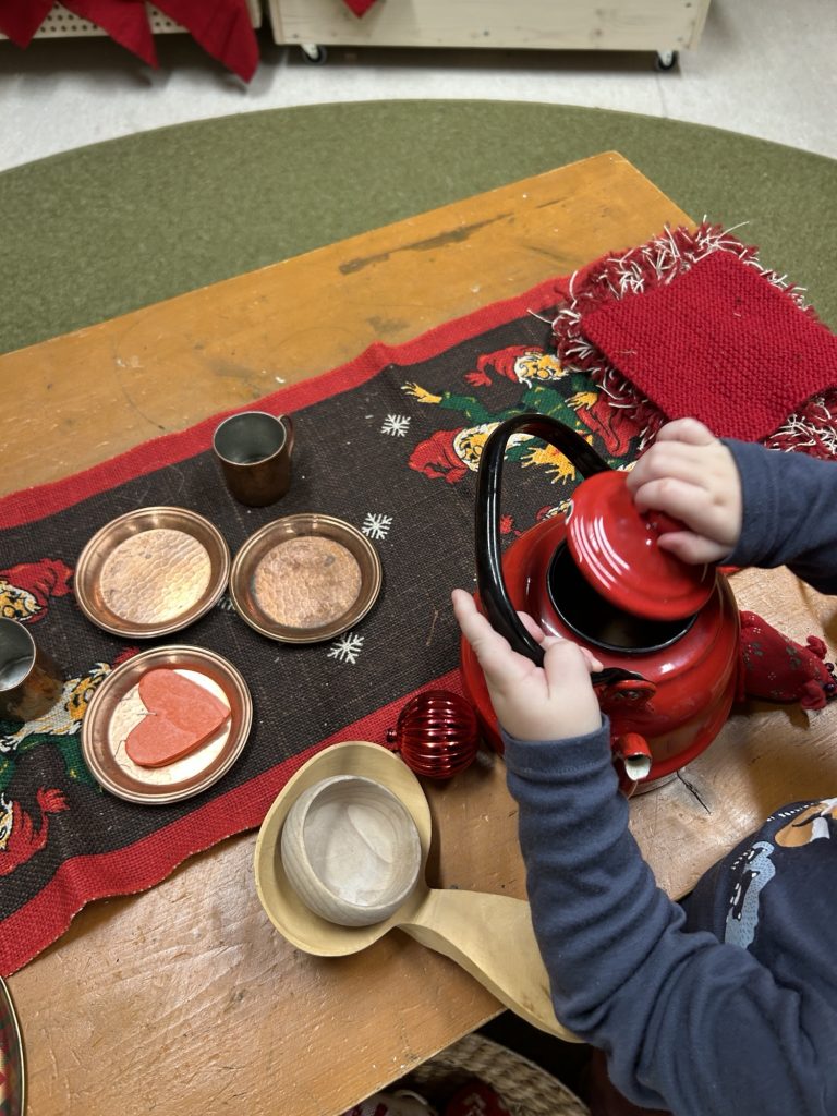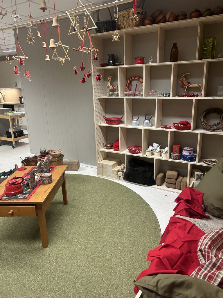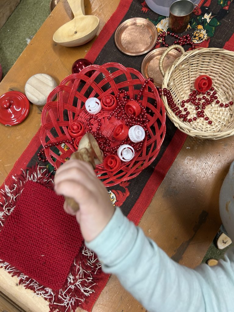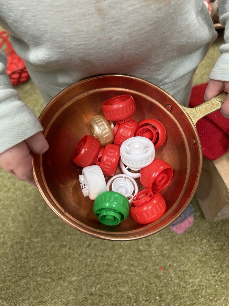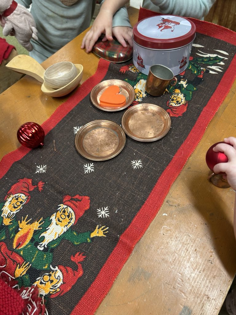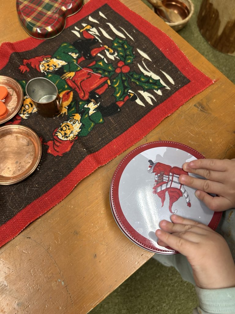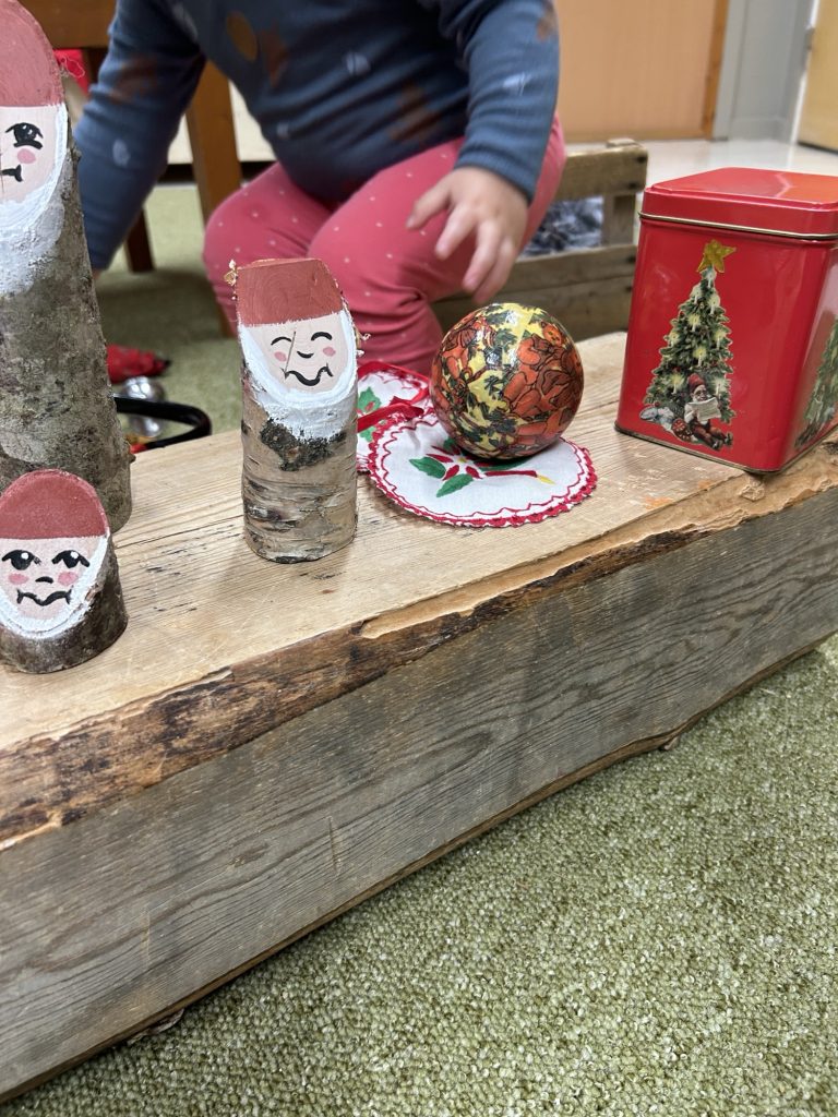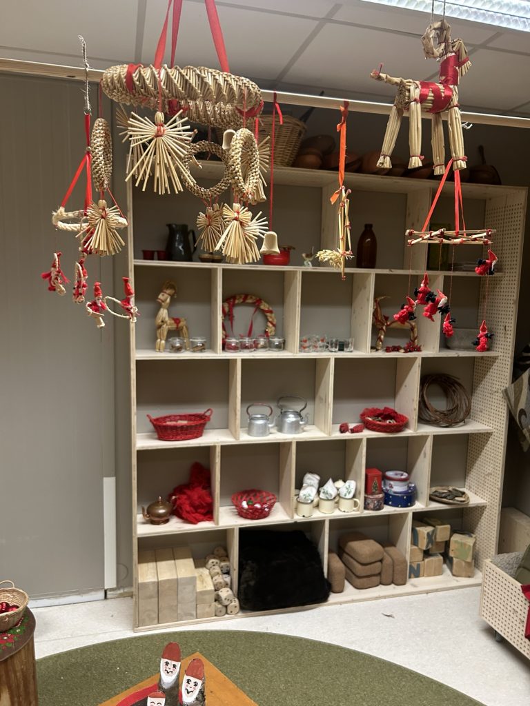Kjøkkenet vårt ligger mellom ettåringen-og toåringenes avdeling. Desember nærmer seg og vi forandrer i rommet med materialer som passer til tiden. Lekemiljøet er dekket for undring, utforskning, spørsmål og å være sammen. Materialer er i forskjellige farger, former og teksturer og nok til alle som vil delta.