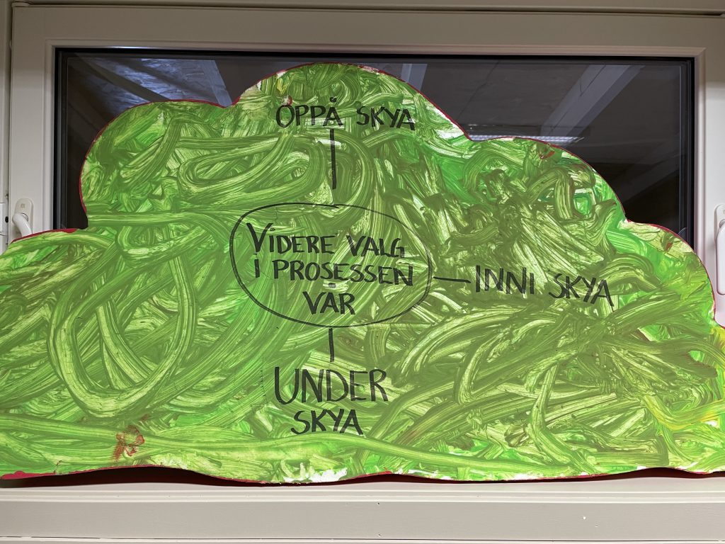 Dokumentasjonen og barnas fortellinger fra julas nye erfaringer, leder oss inn på valget mot et videre steg i prosessen vår: «Over- inni og under skyan».