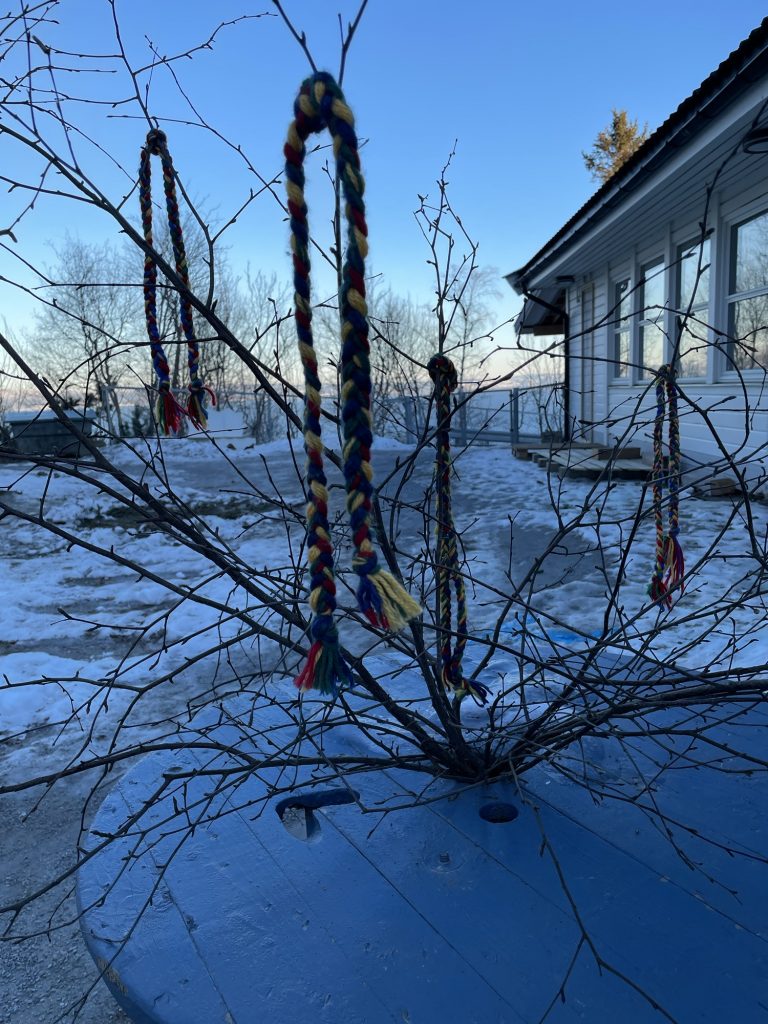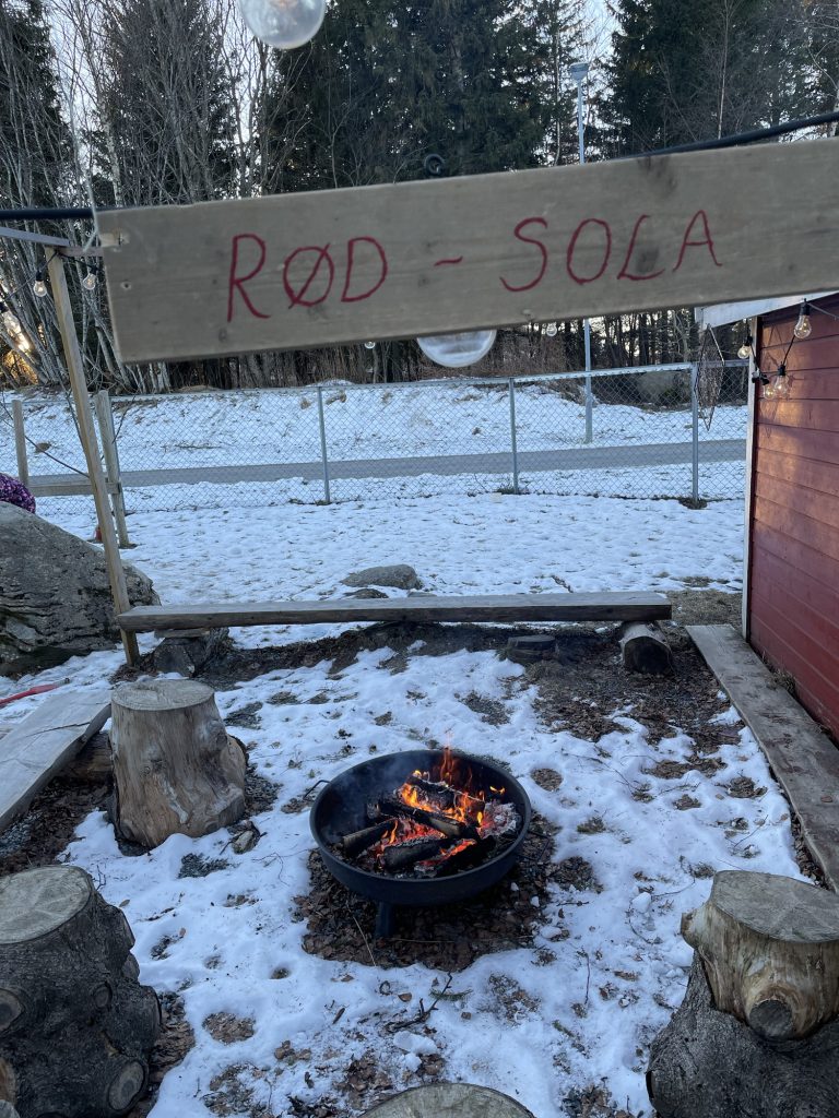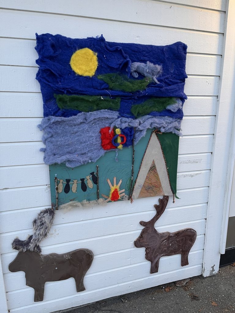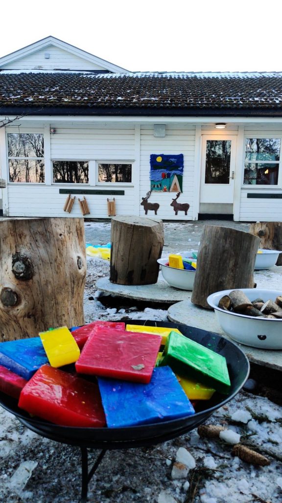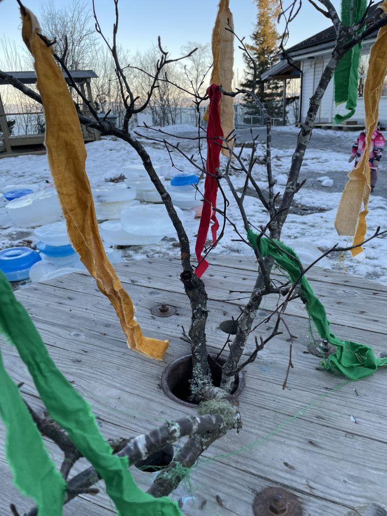 Fargene i samenes flagg brer seg utover uteområdet i barnehagen – rødt, blått, grønt og gult.