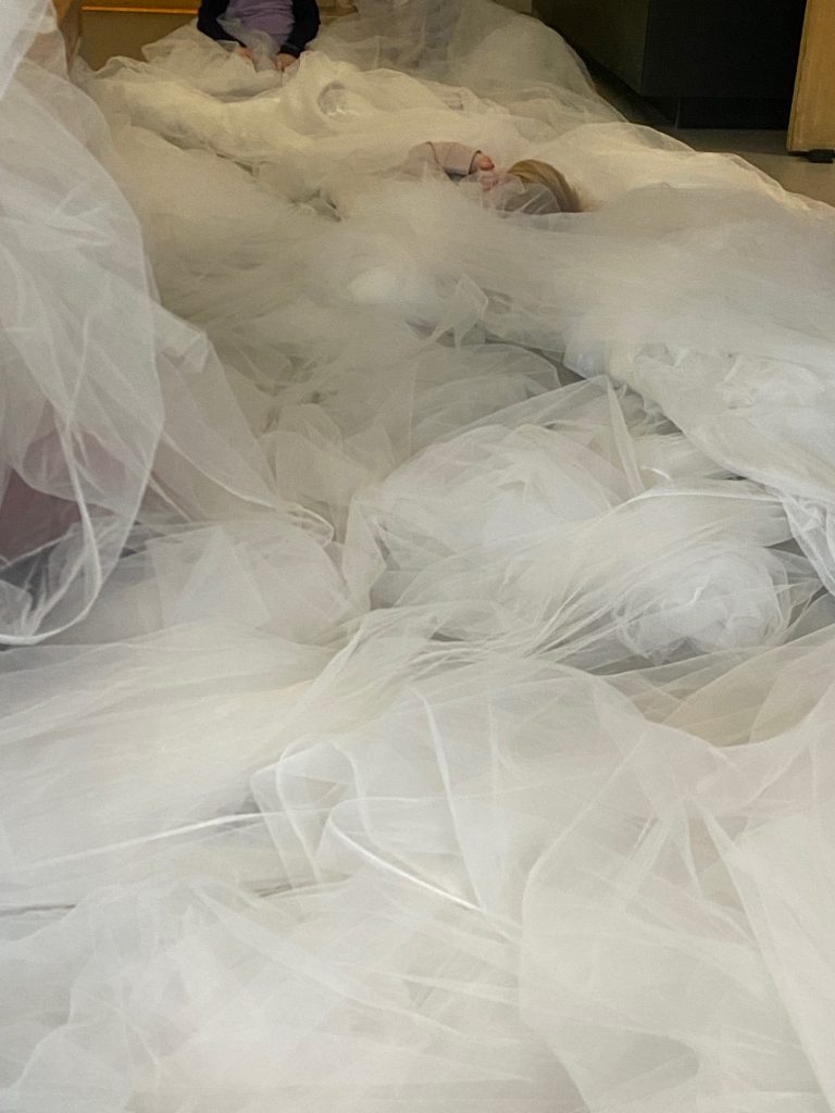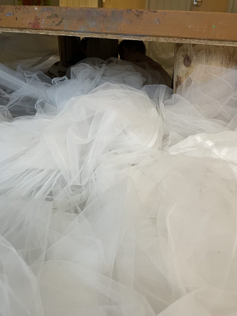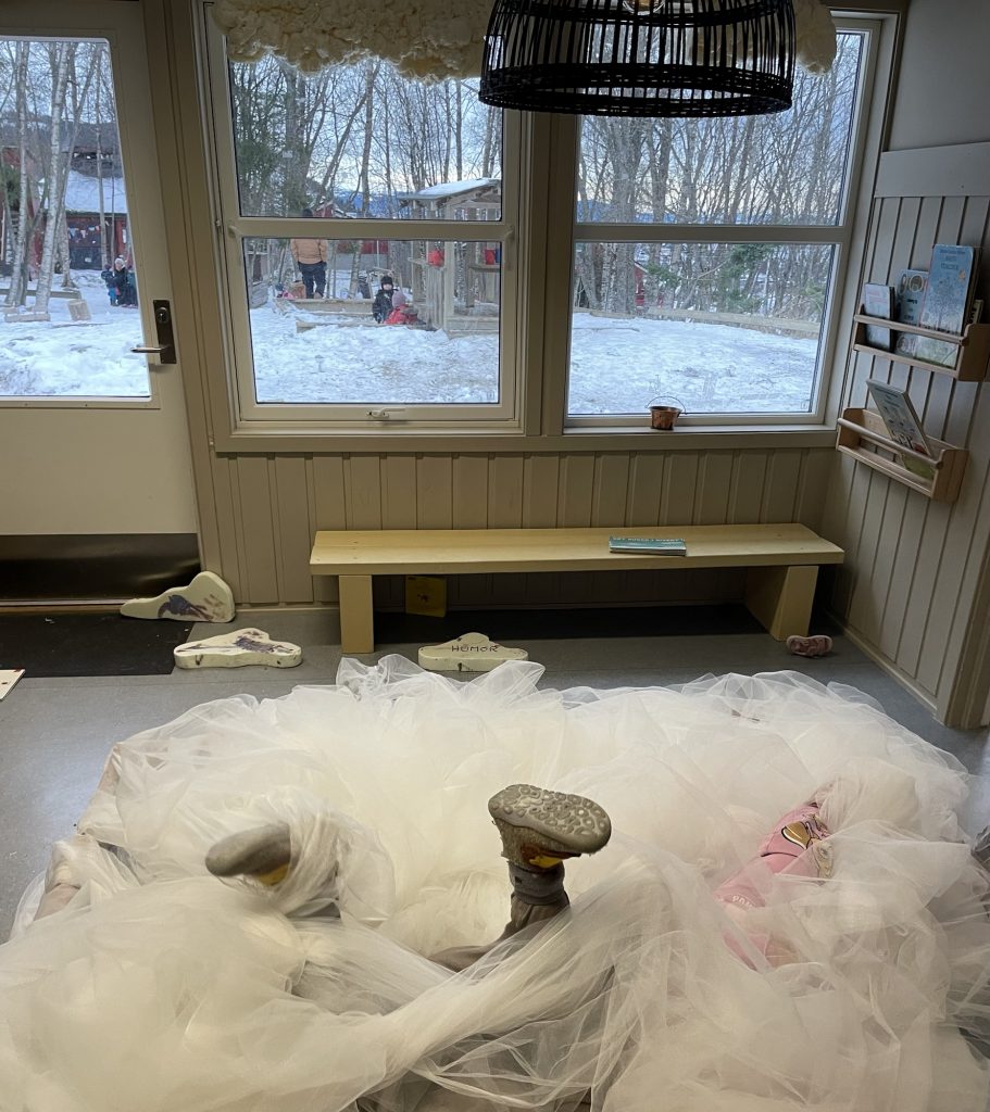 På Haugskya iscenesetter vi med tyll og lyden av regn, torden og vind. Noen av barna er rundt oss pedagoger når vi dekker på, mens andre kommer inn etter utetid til et rom, helt annerledes enn før de gikk ut.