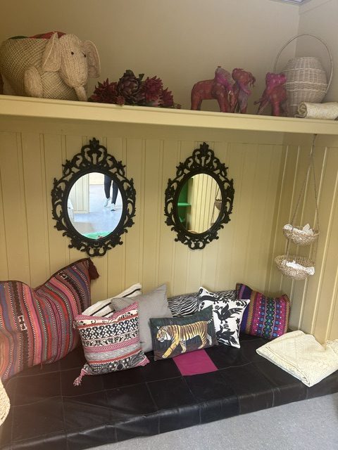 innhold. Her finnes en sort skinnmadrass med masse fargerike puter, speil, store