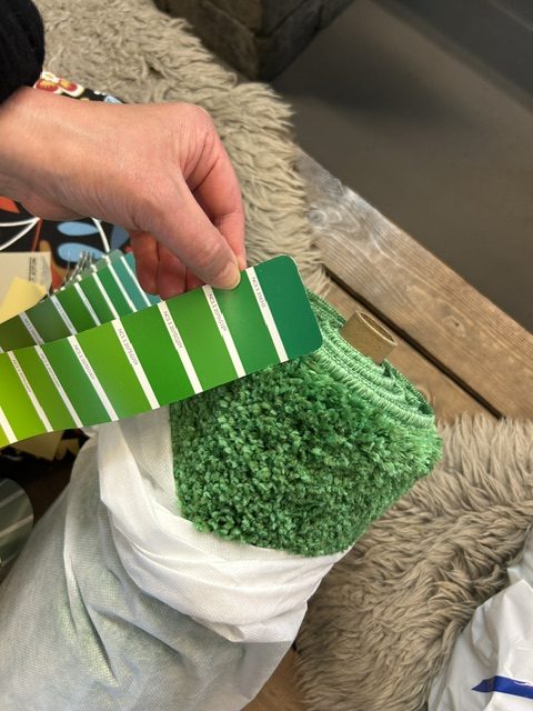 kar, et mykt grønt teppe, et lite sort metallbord, en knallrød tømmerstokk og en
