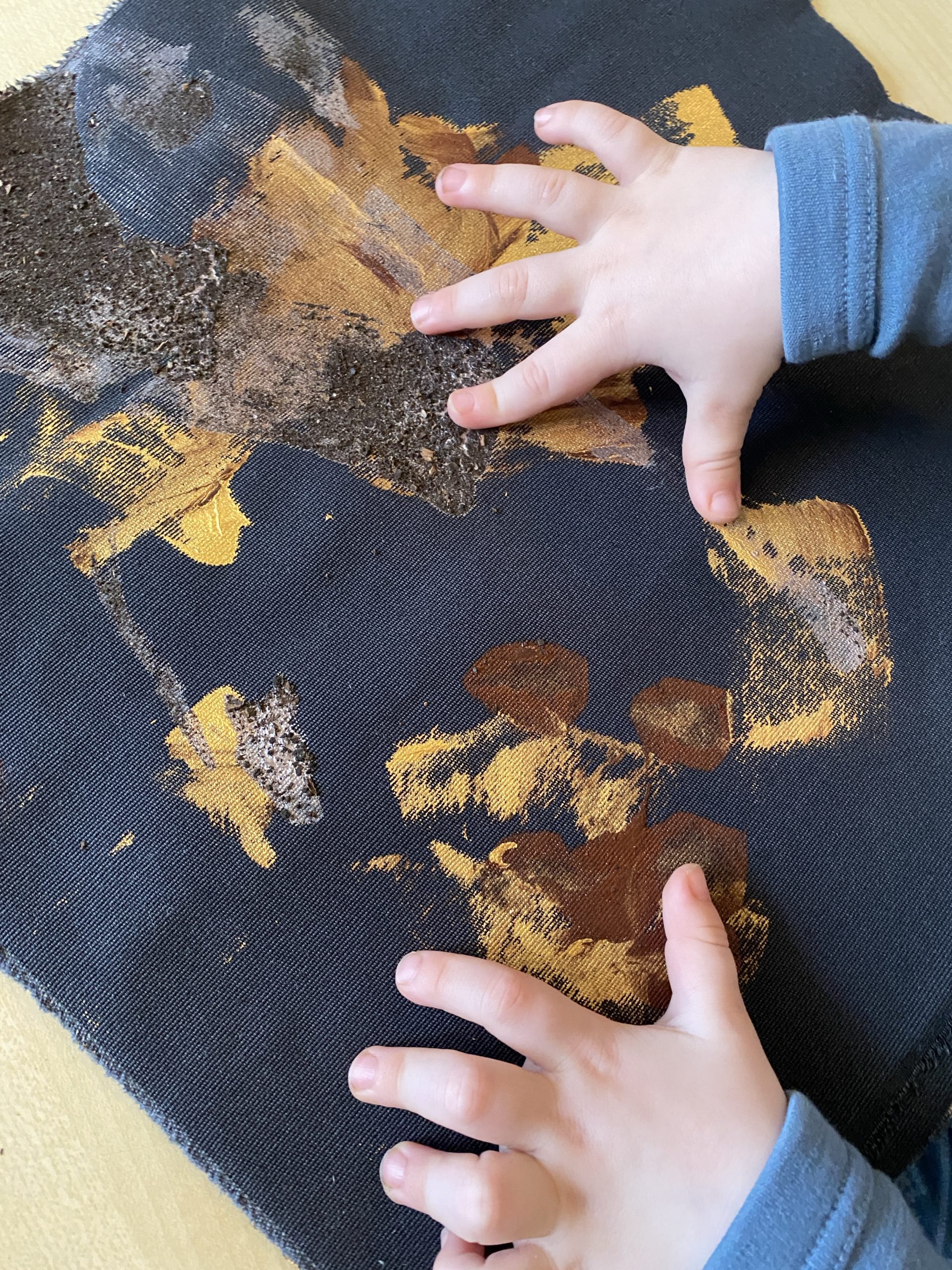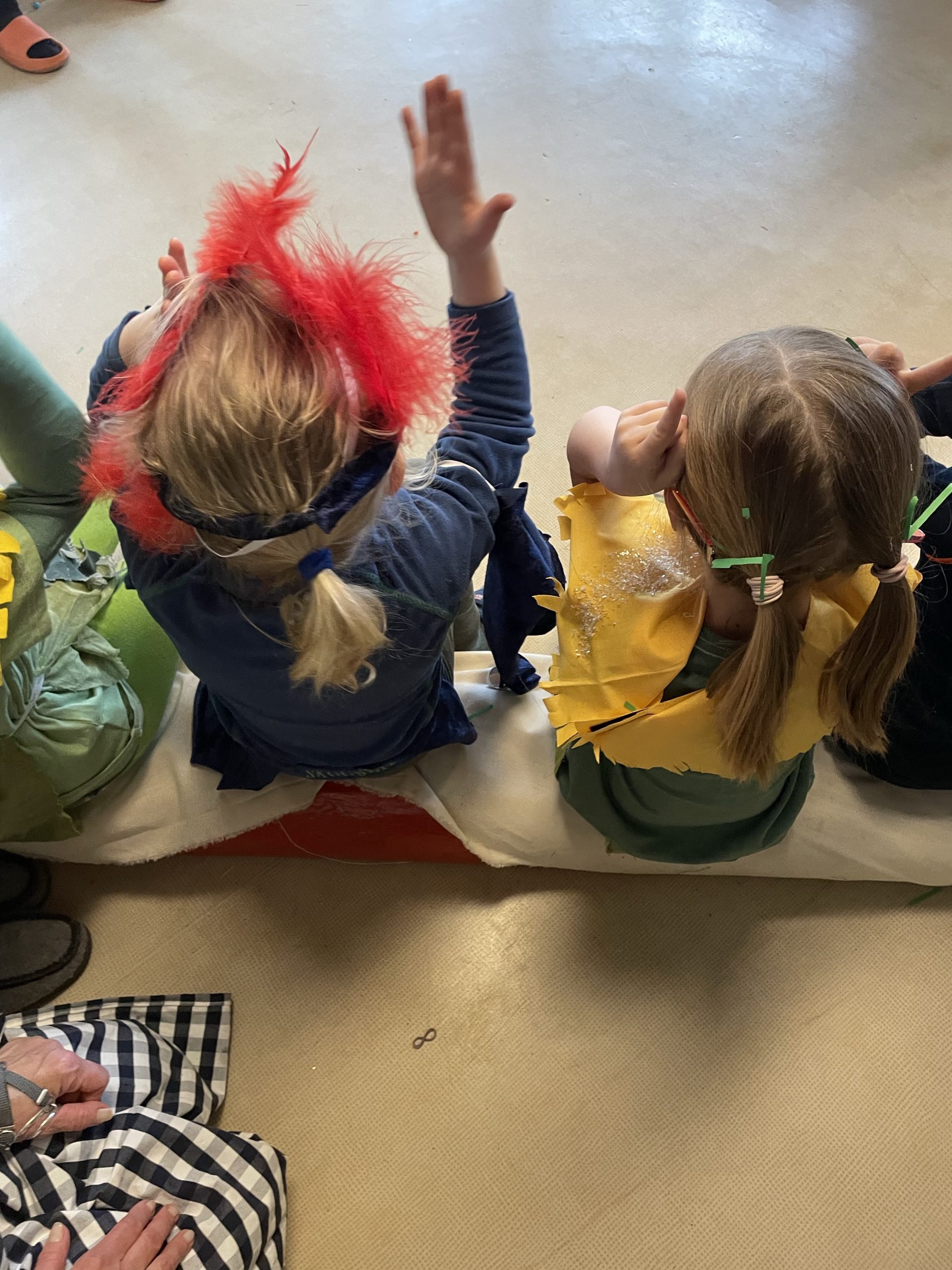 Vi beundrer de fine jordkostymene vi har malt og limt jord på. Vi prøver dem på og tester dem på en runde rundt i barnehagen. Med oss har vi sangen og bevegelsene fra sangen vår «Frøet» av Finn Kalvig. En liten generalprøve før den store karnevalsdagen i morgen!