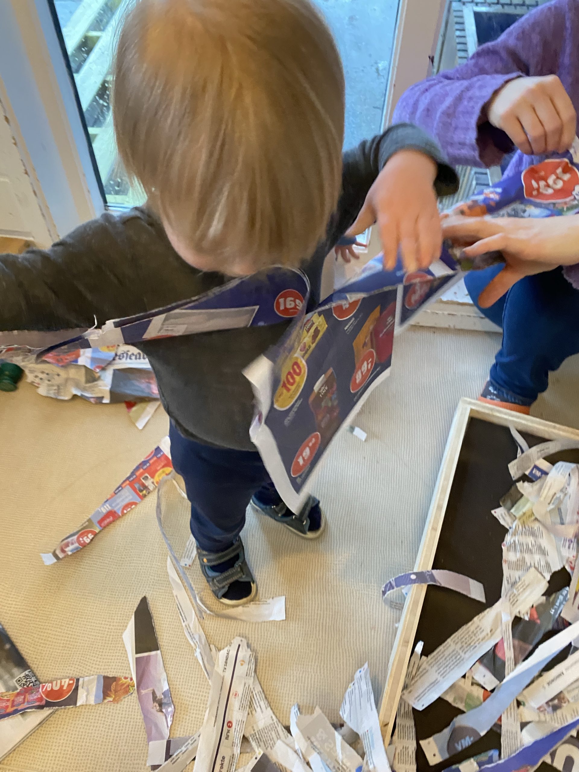 I dag har vi begynt å jobbe med et nytt materiale, nå er det papir barna skal bli kjent med. En ny installasjon skal få plass inne på Stjerne. Vi skal lage oss en «jordhaug» av pappmasjé. Hvis noen har gamle aviser liggende, ta dem gjerne med!
