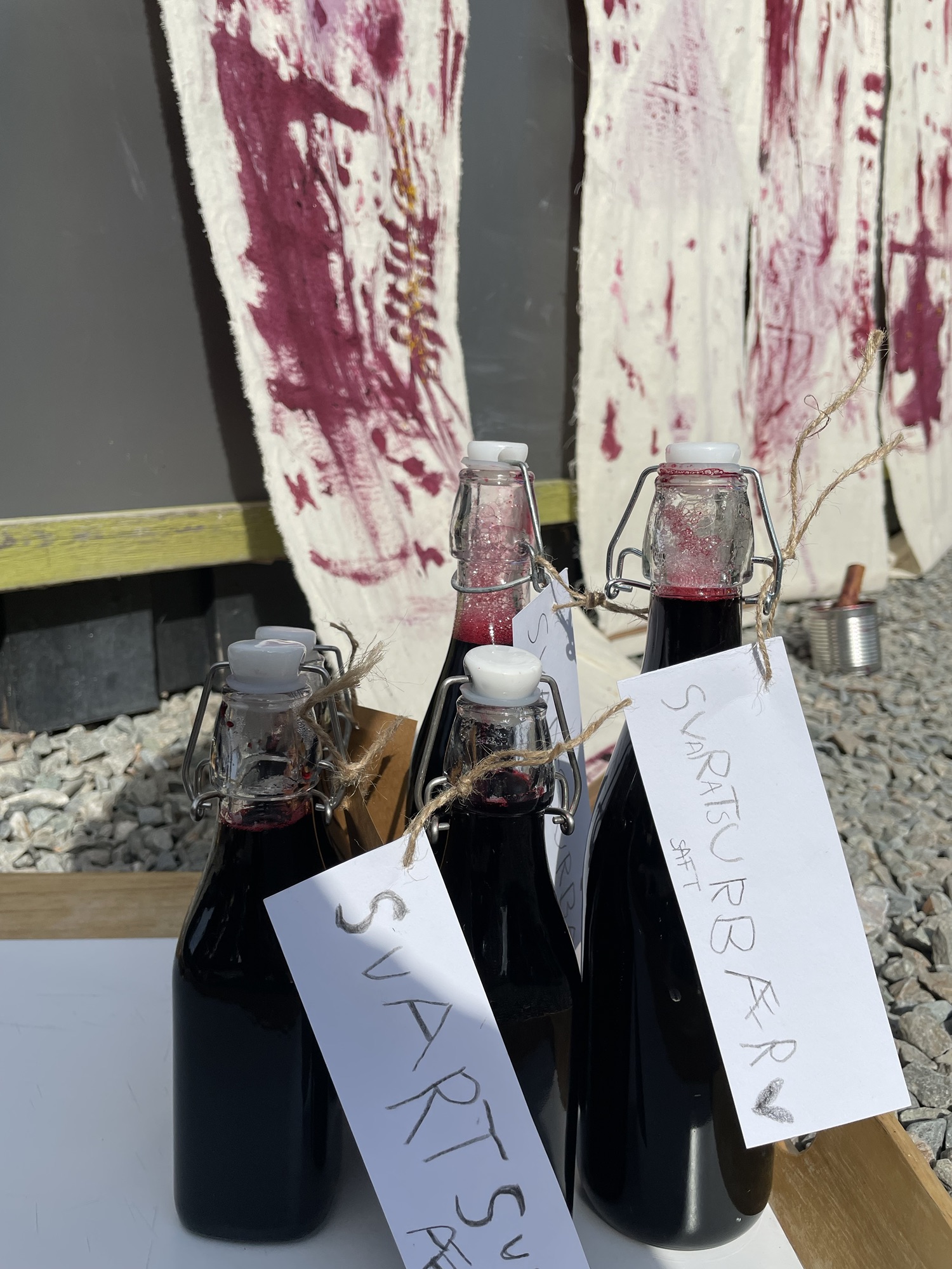 «Det bugner i hagen min av svartsurbær» Familien bringer inn en pose med svartsurbær til barnehagen. Når vi koker bærene til saft, blir vi fascinert av fargen som kommer ut. En knall sterk begunder lilla farge, vi ser mulighet til å overføre fargen til kanvas stoffet vi jobbet med i går.