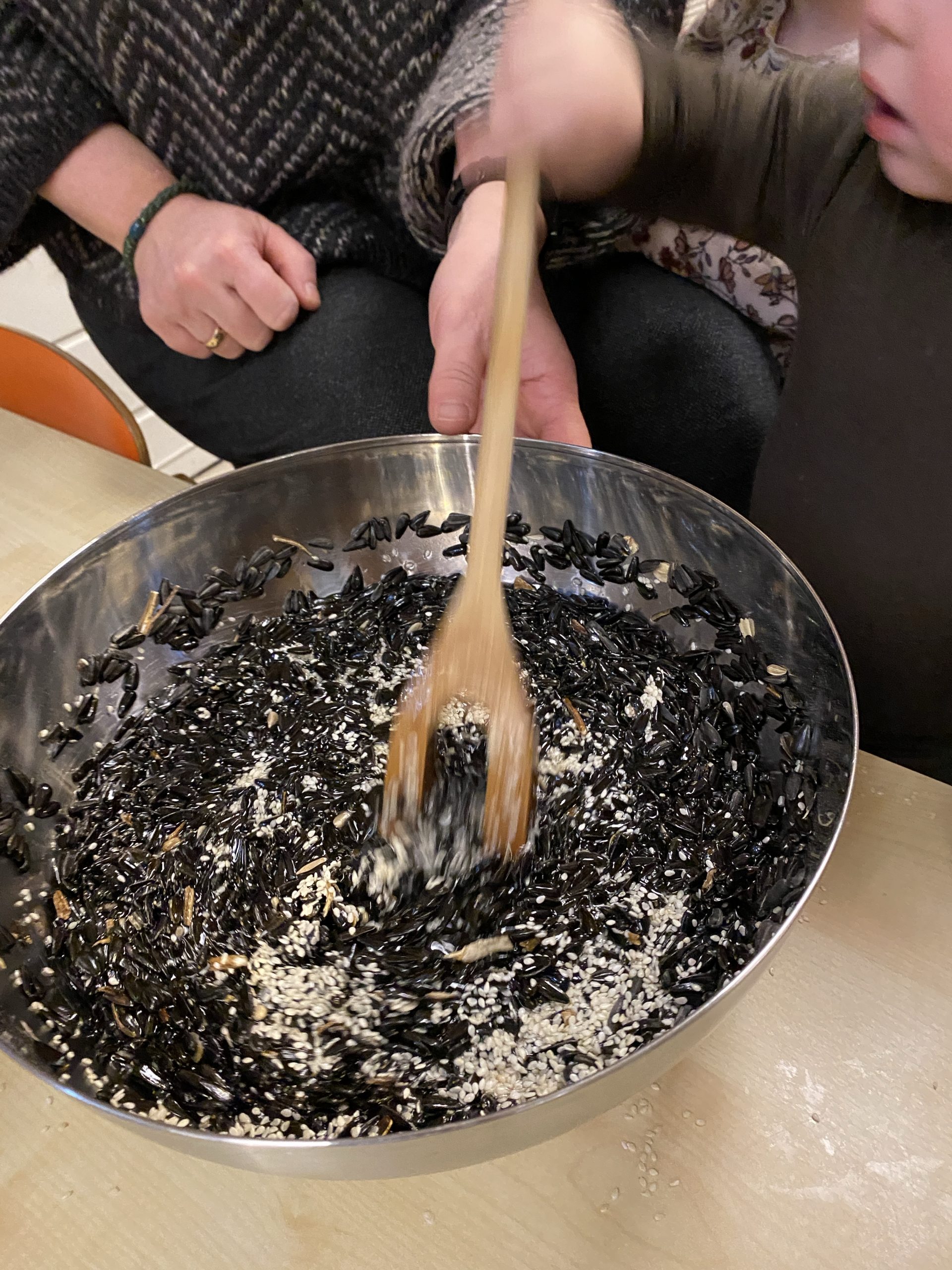 Nå har det vært kaldt lenge og vi har har sett og hørt lite fugler. Kanskje fuglene vil komme hvis de finner mat her? Vi blander frø og delfiafett og henger det ut i trærne.