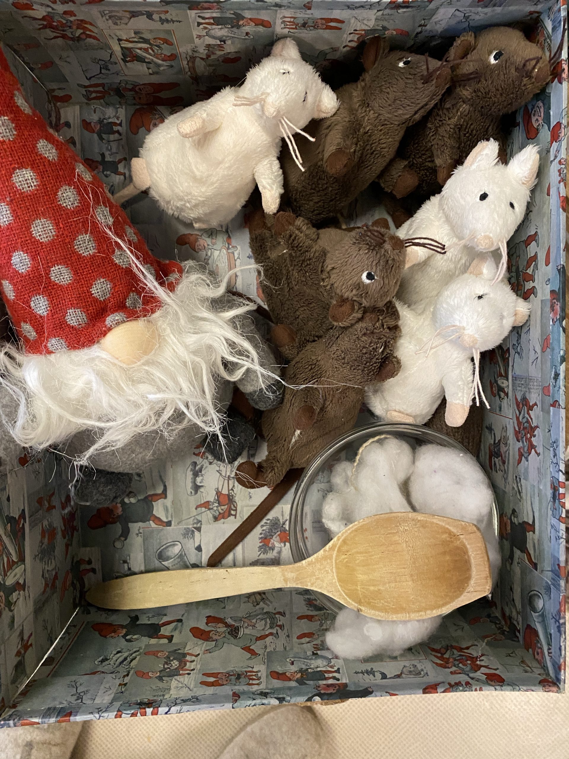Til adventstiden skiftet vi ut mye av materialet, og rommet er preget av kuler, stjerner, mus, trær, nisser og dyr. Hva gjør dette nye materialet med leken? Hva vil vi med materialene vi tilbyr? Vi skaper møteplasser. Vi skaper undring.