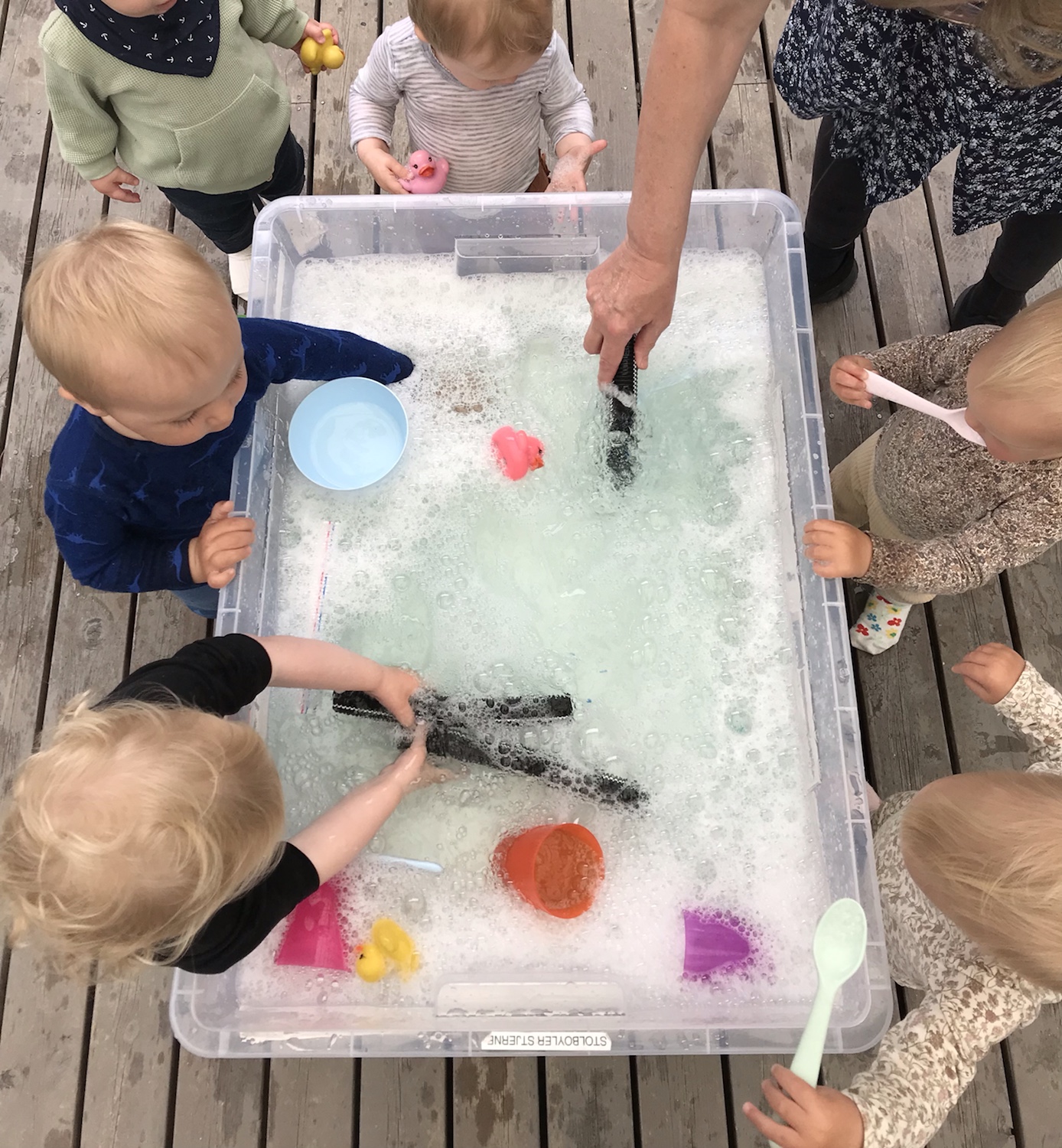 På slutten av barnehageåret er det mye som skal fikses og ordnes i barnehagen til nytt barnehageår. I dag ble gulv og vegger vasket i utestua. Bøtter med vann svamper, kluter og masse skum gir arbeidsglede.