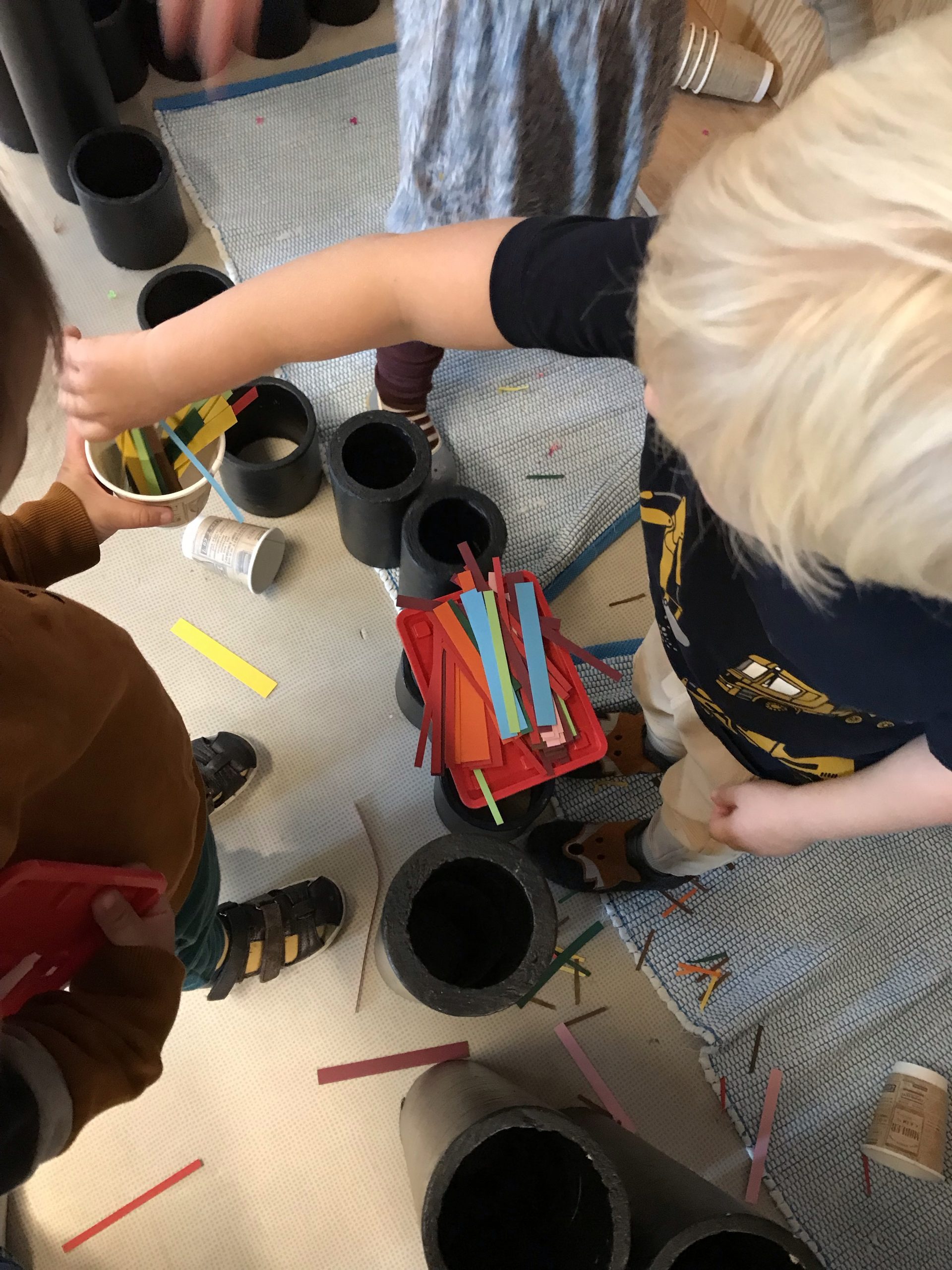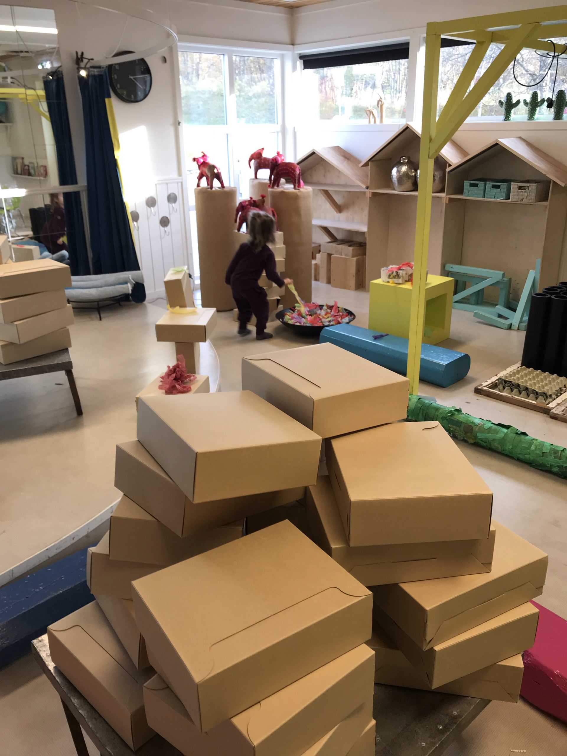 Vi introduserer nye store materialer på Rakettrommet. Som en del av plantiden blir materialene forberedt og presentert i rommet. Barna blir nysgjerrige når vi forbereder på en måte som er synlig for dem. Store isopor-sylindere blir kledd med papir. Disse har vi fått og er gjenbruk fra håndverkbransjen. Vi finner esker i stødig kartong på […]