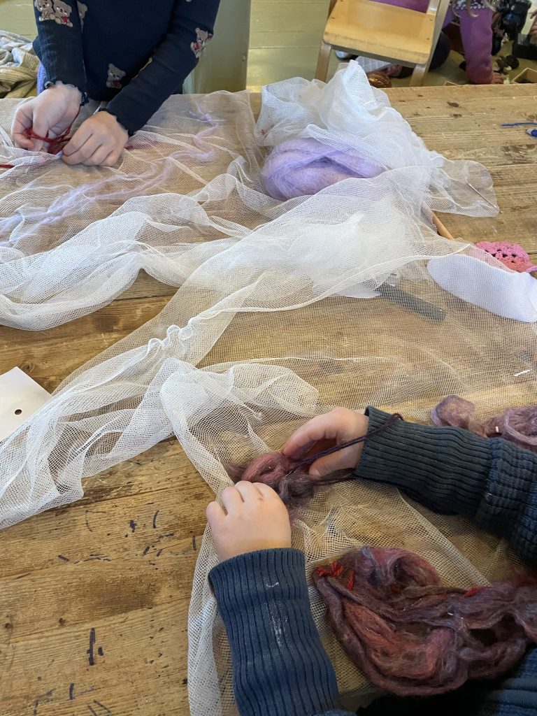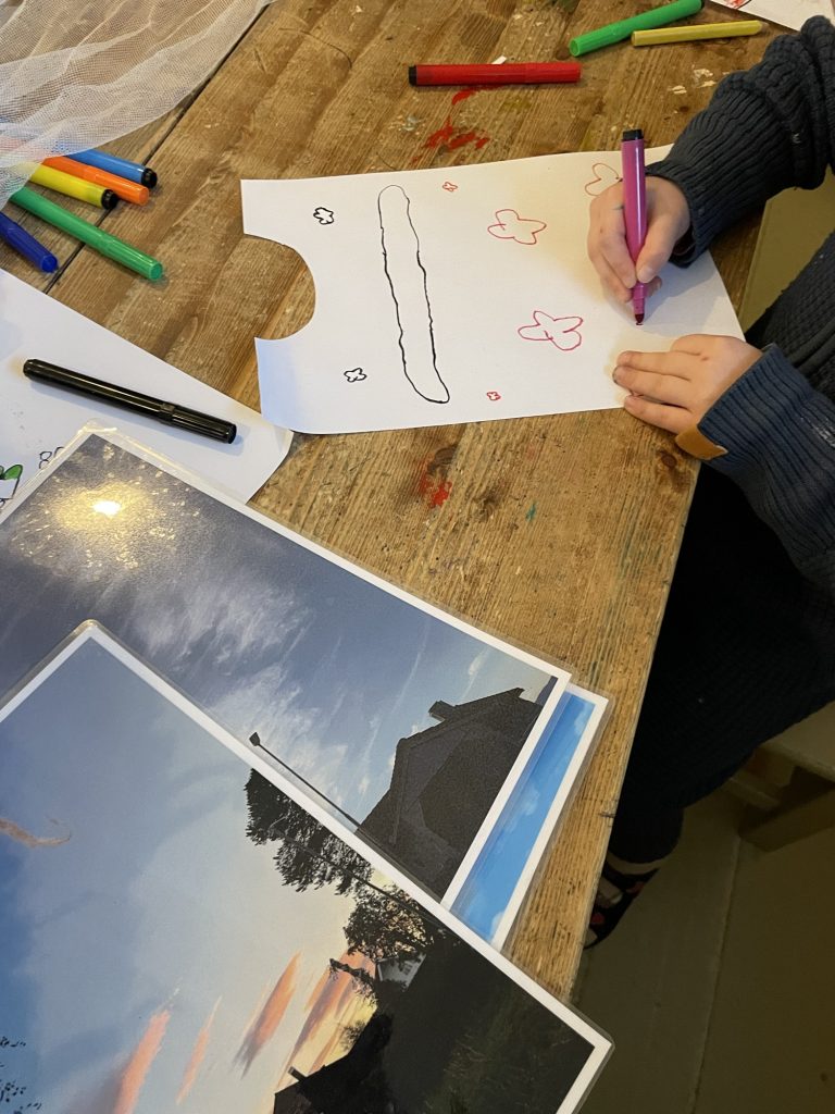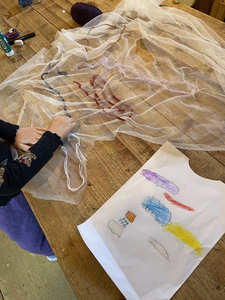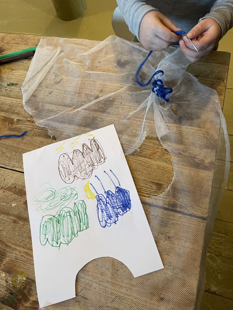 Barna lager seg arbeidstegninger med idéene de har, fordi når tankene forklares for andre eller nedtegnes, da blir de både videreutviklet og mer virkelige. Så går de i gang med selve syarbeidet. Gruppa har god erfaring med nål og tråd, for i fjor sydde de kostymer med strå på. Nåla beveger seg opp og ned mellom maskene i tyllstoffet og de vakreste skyer kommer til syne.