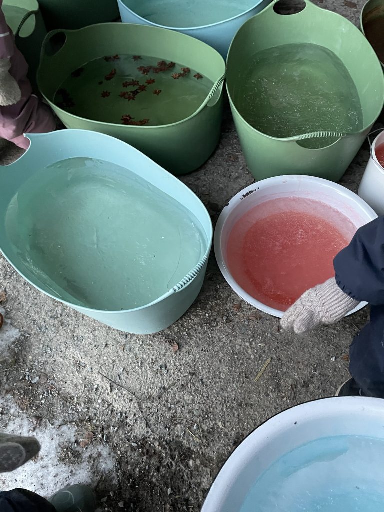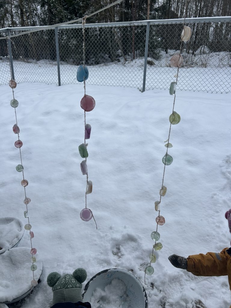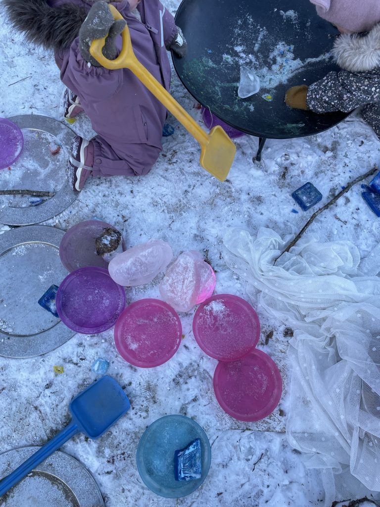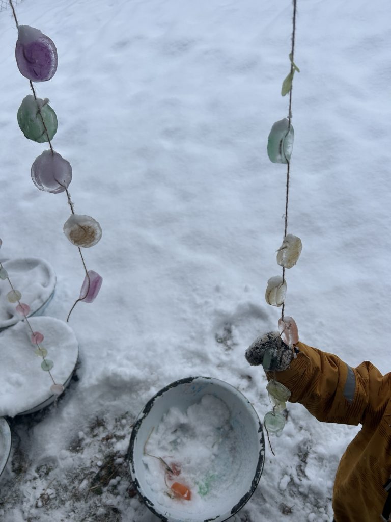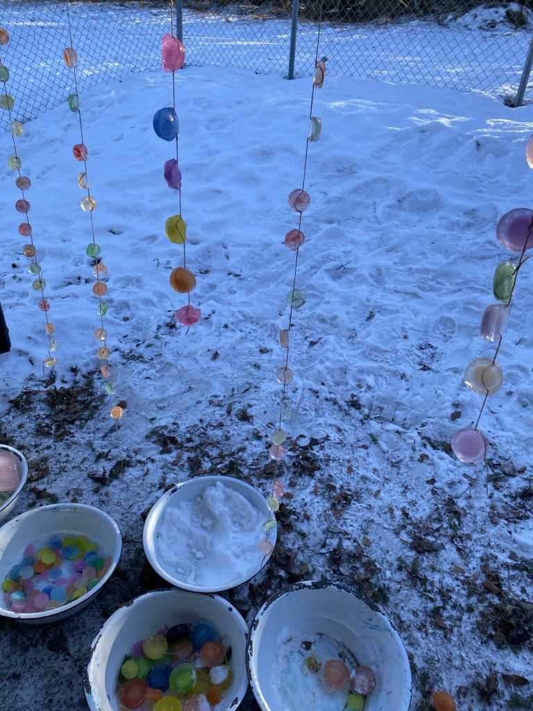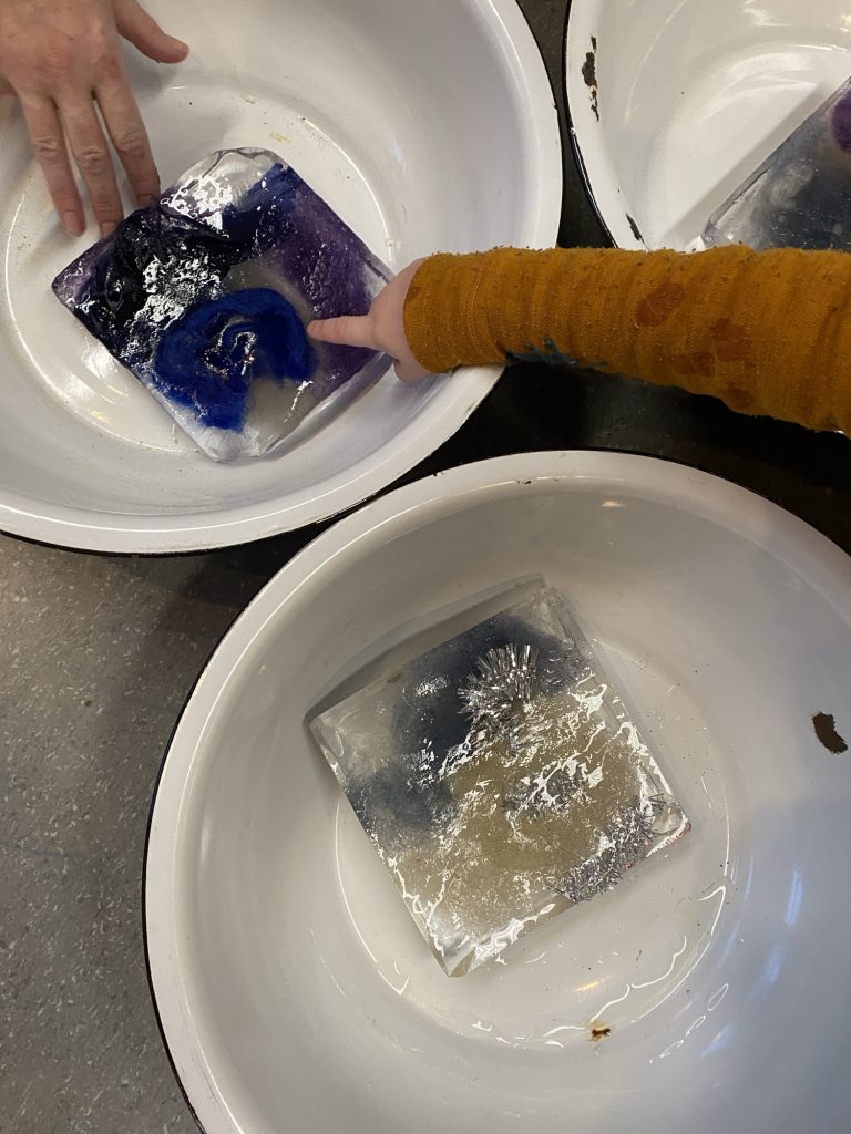 Sammen fyller vi opp kar, bøtter og ballonger med vann og fyller på med ulike ingredienser som gir nysgjerrighet og forundring. Dag etter dag ser vi hvordan isen endrer seg.