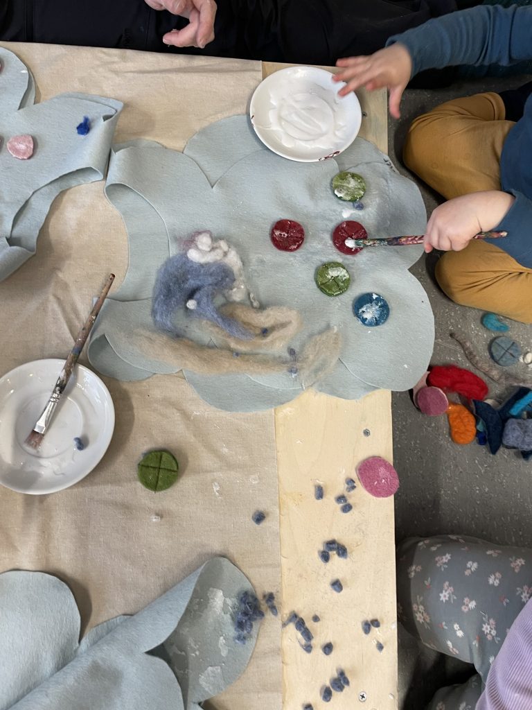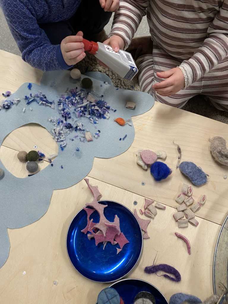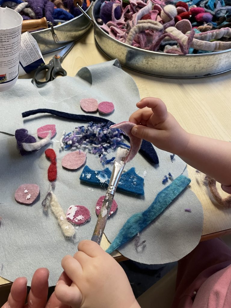 Når vi tilrettelegger for å jobbe med kostymet er det viktig for oss at barna er delaktig. Femten 2-åringer med ulike erfaringer, tanker og ideer. Vi inviterer til arbeid med kostymet på en arbeidsplass der materialet er presentert på en oversiktlig måte, slik at barna får ta aktive og egne valg. Vi prater om farger, former, valg og beskriver hva vi ser. Vi støtter barnas ideer, og deres kreative utfoldelse som gjør identiteten i hvert enkelt kostyme.