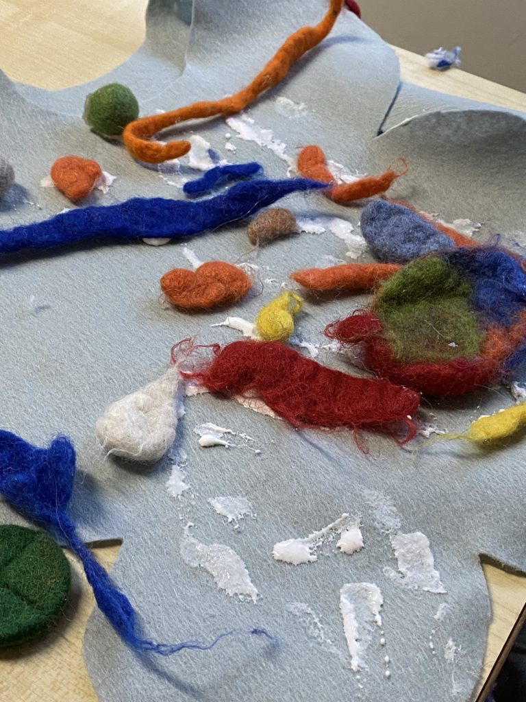Tovede ullremser legges side om side. Ullknapper stables oppå hverandre, en etter en. En konstruksjon på kostymet, som også speiler hvordan barnet