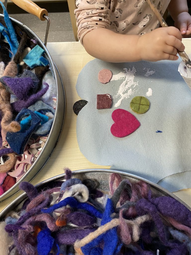 Barnet trekkes mot de små ullkulene. En etter en plukkes de opp, og med fingeren viser barnet hvor de skal limes på.