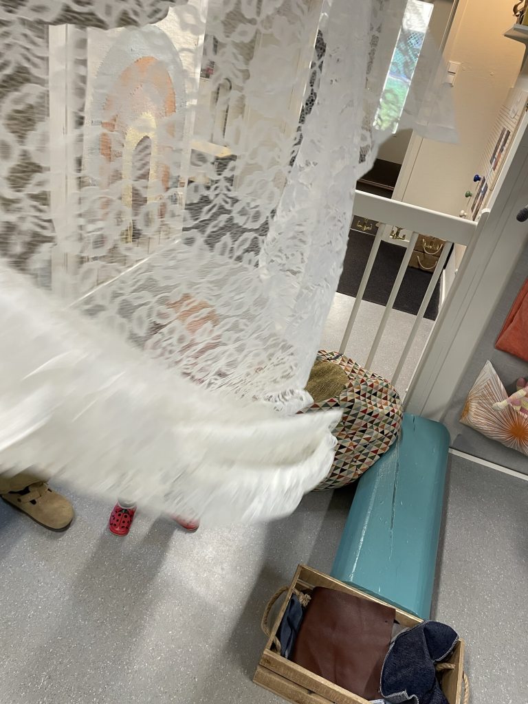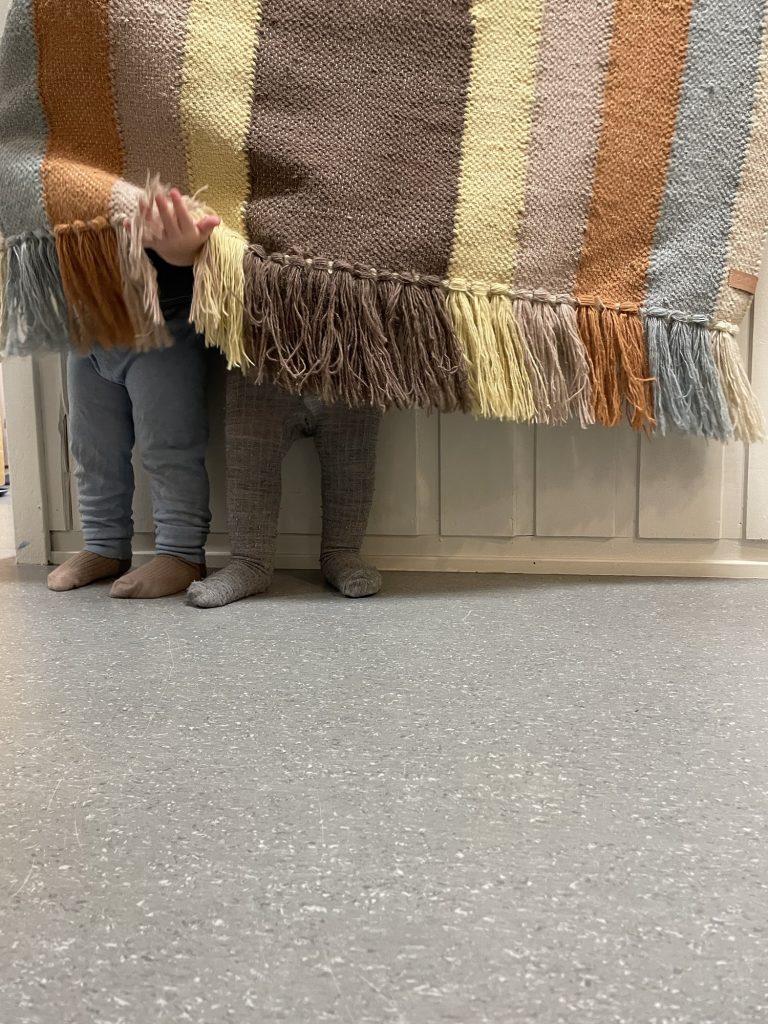 Gjennom hele høsten har vi sett hvordan barna har gjemt seg bak teppet i gangen, bak putene på veggen og under teppene på avdelingen. Gjennom tilrettelegging av ulla, har vi sett at barna har tatt med «borte-titt-titt»- leken inn sammen med ulla.