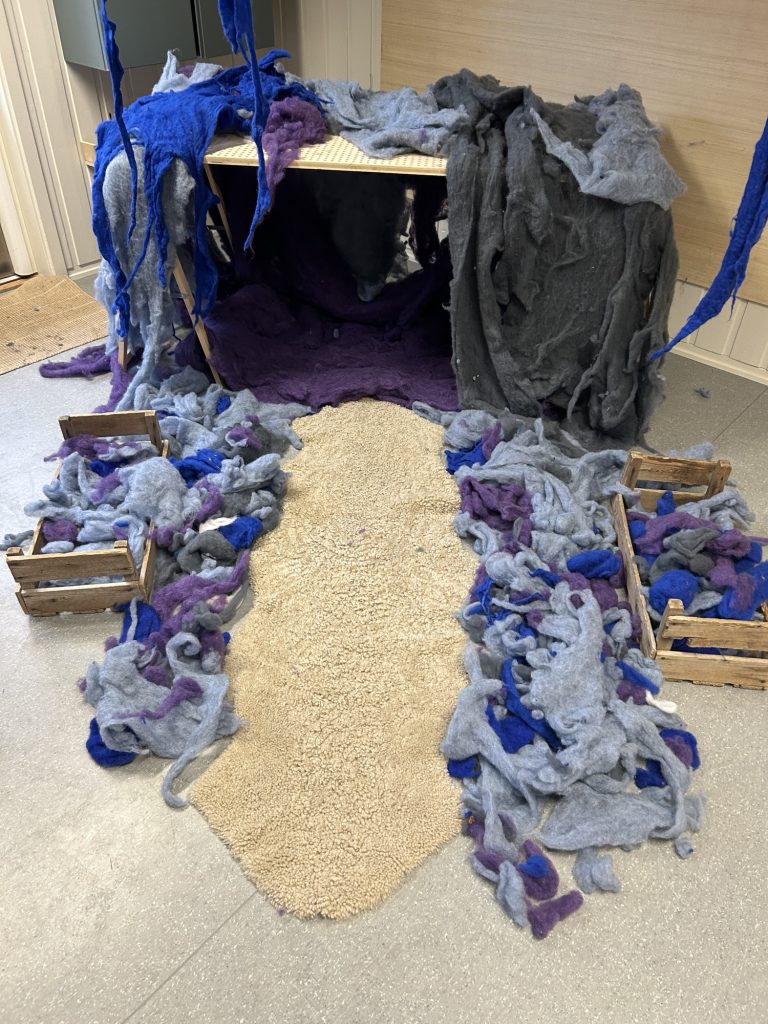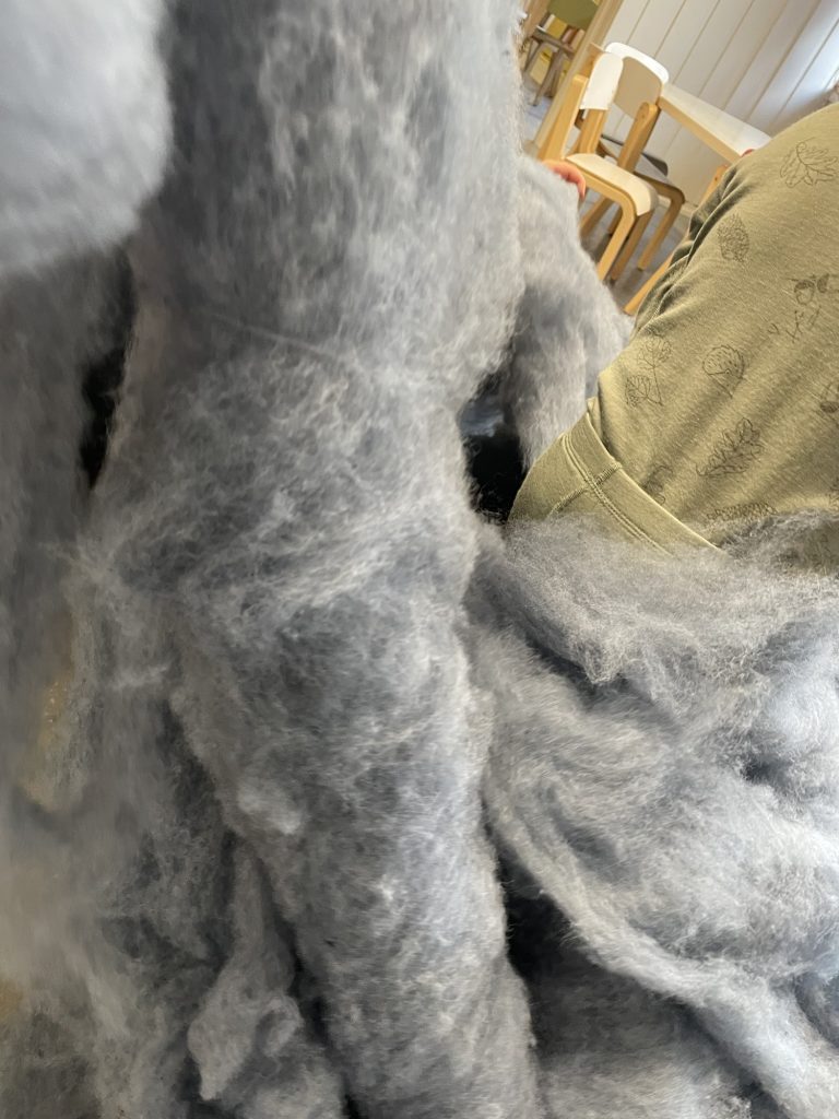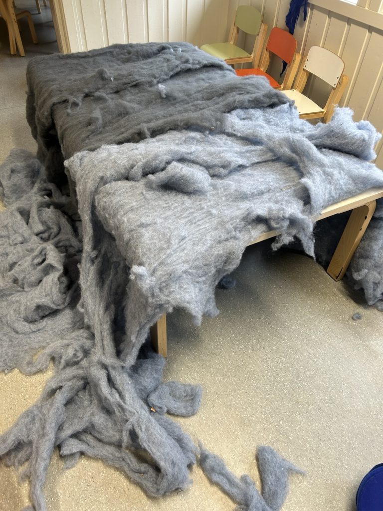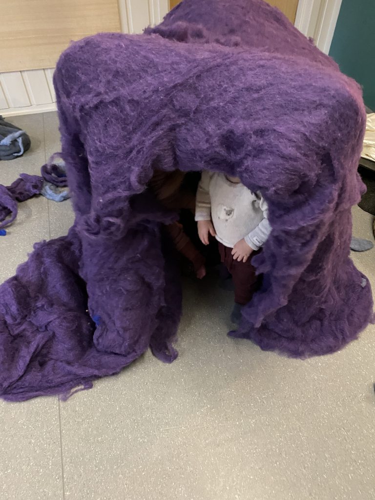 Når vi leker med ulla vår er vi oppi den, vi har den over oss, tuller oss inn i den og gjemmer oss i den. Den alders typiske «borte-titt-titt» leken har blitt et fellesskap der alle tar del.