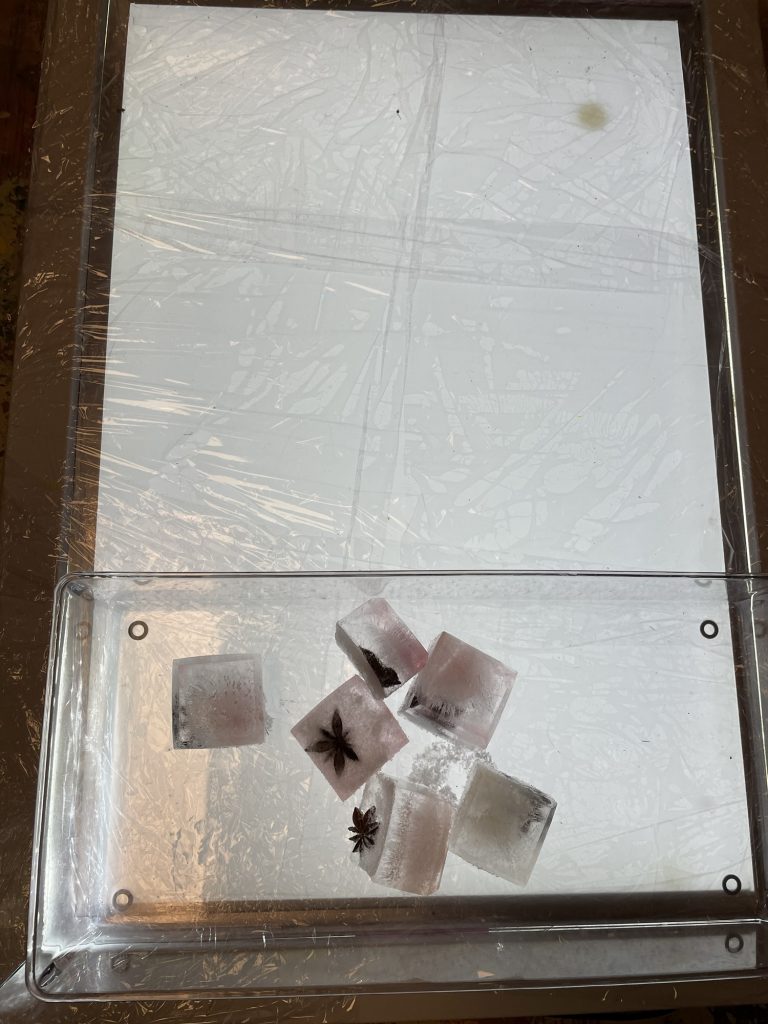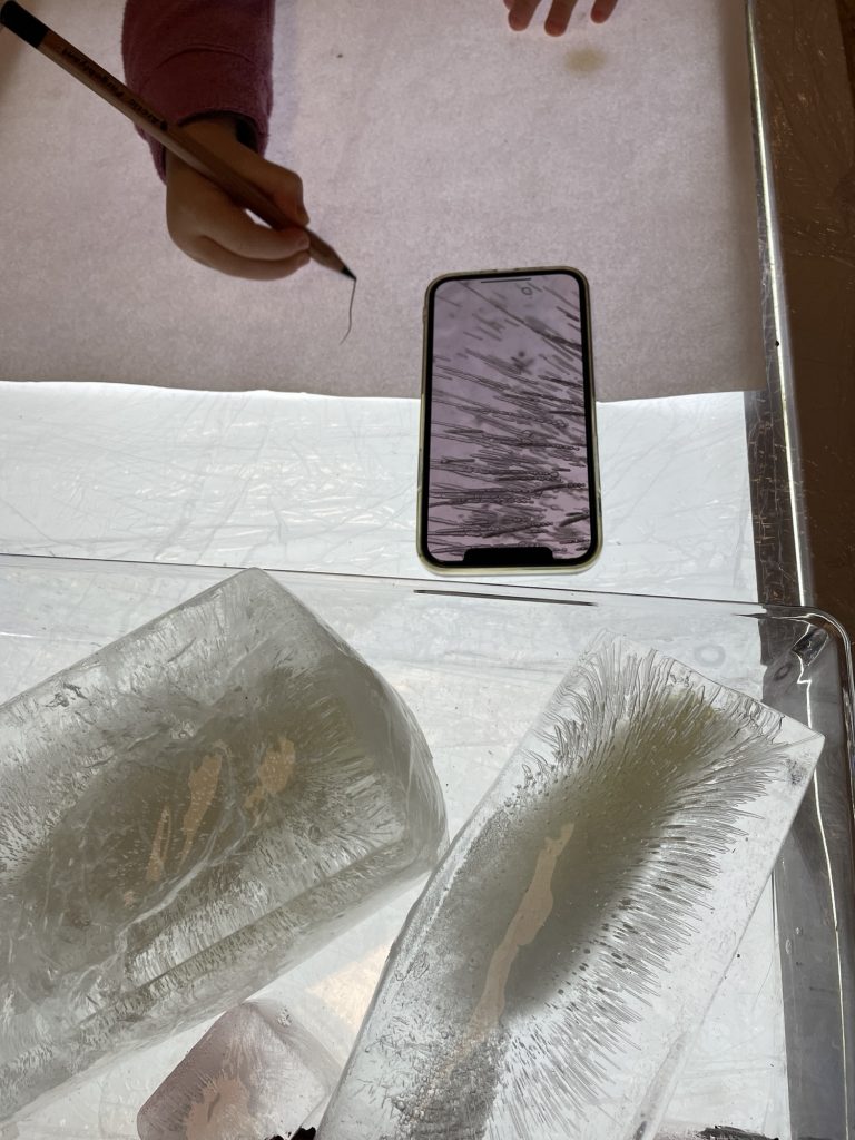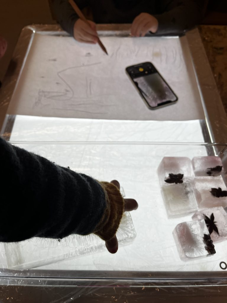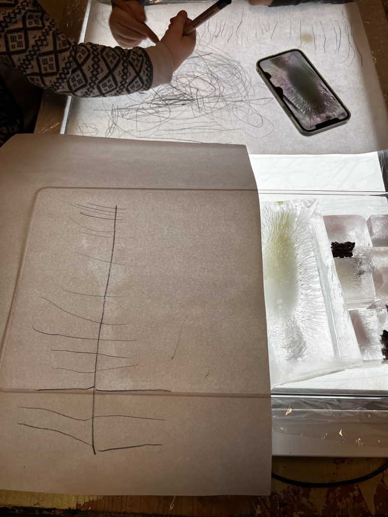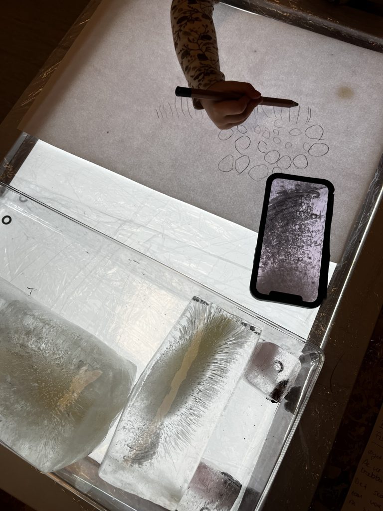 I dag tok vi frem lysbordet, isbiter vi laget tidligere i uken, et ark i A3 størrelse og svart blyant. I tillegg bruker vi telefonen som en digital forstørrelsesglass hvor vi kan se nærmere på isen.