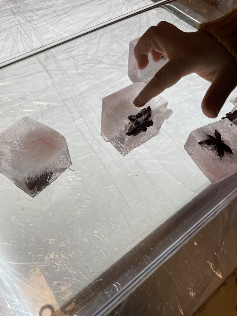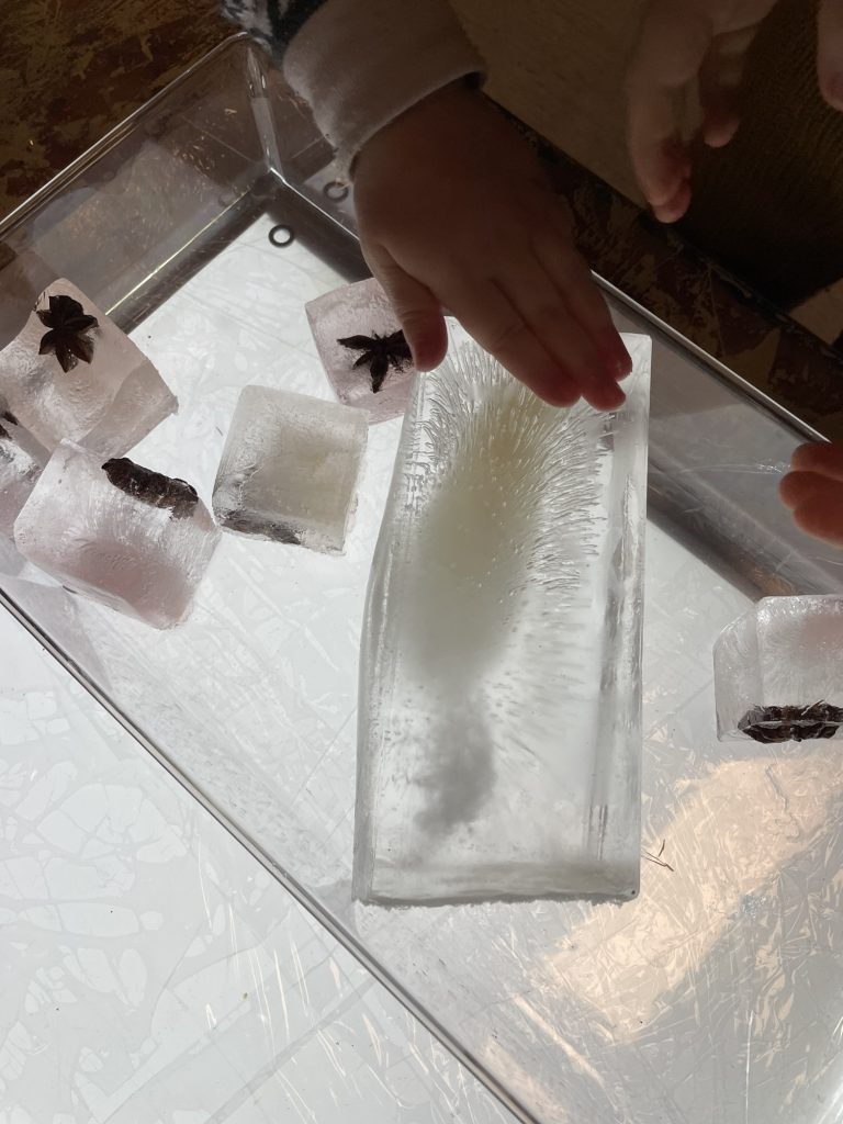3 åringer fordyper seg i detaljer i møte med is og lys.