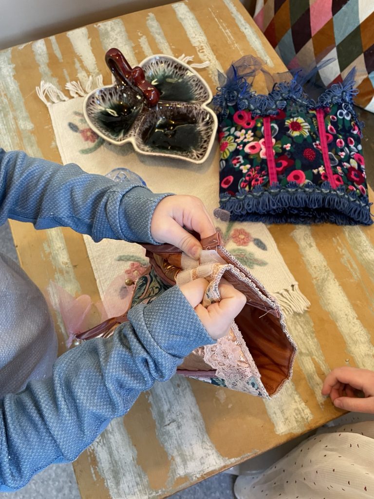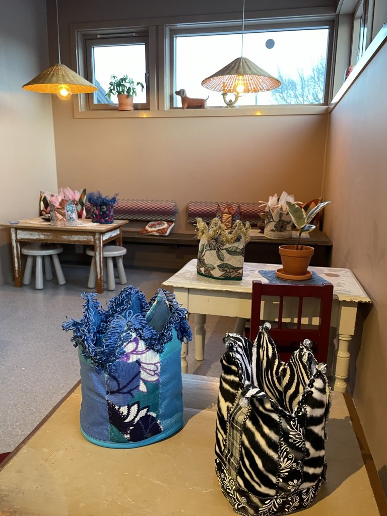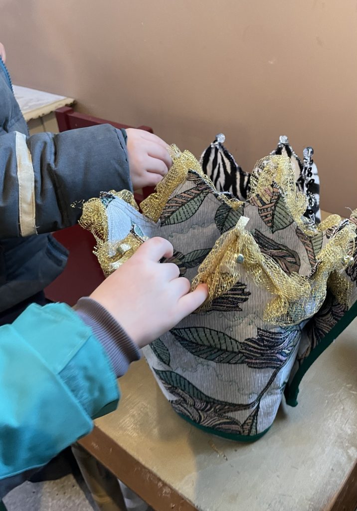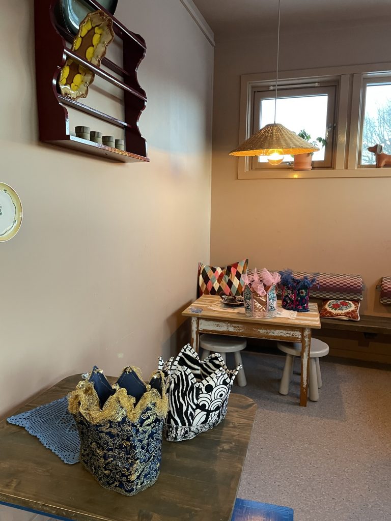 Vi bestemmer oss for å lage en liten utstilling på kafeen vår. Rommets mange små bord gir kronene en verdi . En tom bordflate gjør at kronene skinner i rommet. Når Zoi forteller med stolthet og kjærlighet der skapergleden kommer frem, skapes det nysgjerrighet og vibrasjoner i kroppen. Dette er med å lade til barnas bursdag.