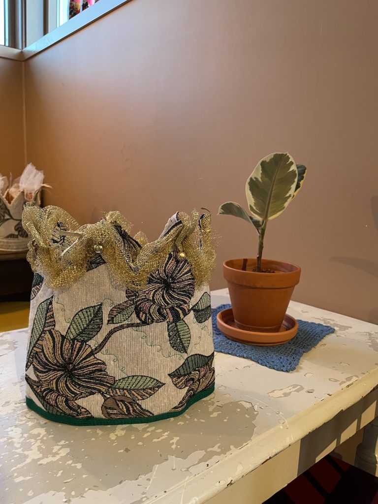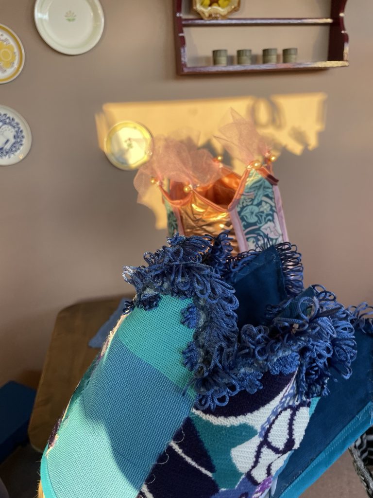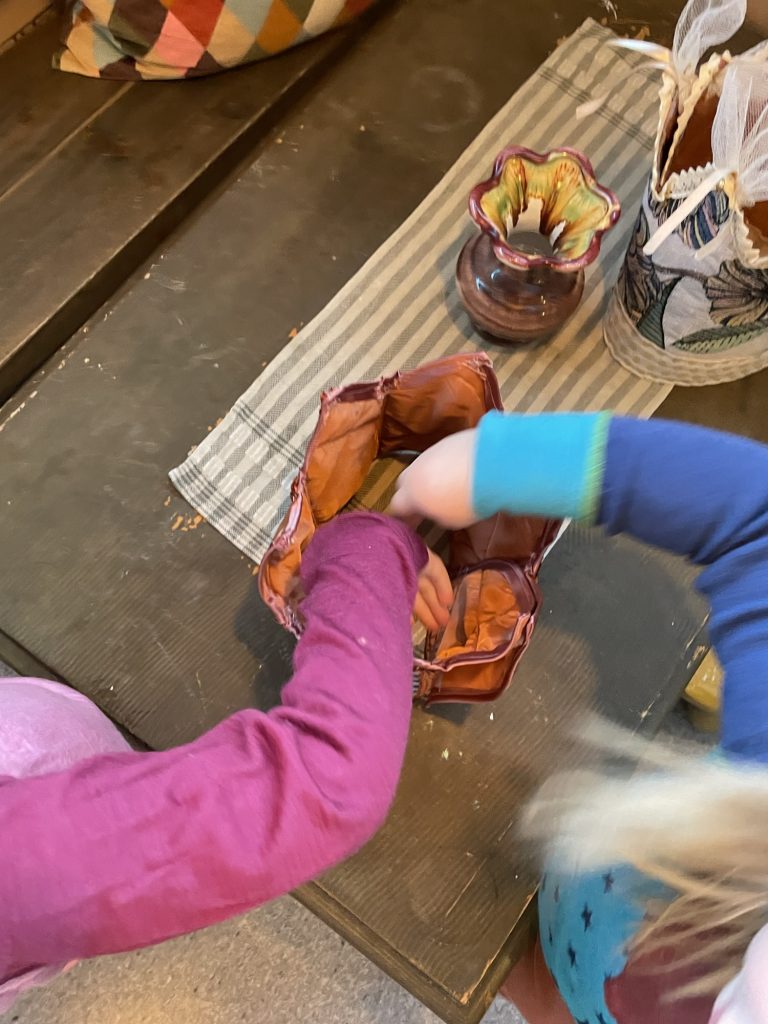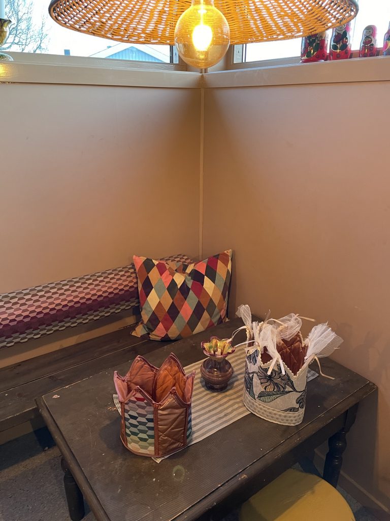 Vi bestemmer oss for å lage en liten utstilling på kafeen vår. Rommets mange små bord gir kronene en verdi . En tom bordflate gjør at kronene skinner i rommet. Når Zoi forteller med stolthet og kjærlighet der skapergleden kommer frem, skapes det nysgjerrighet og vibrasjoner i kroppen. Dette er med å lade til barnas bursdag.