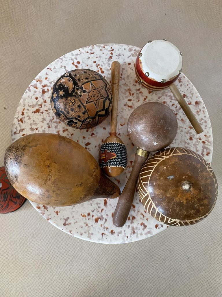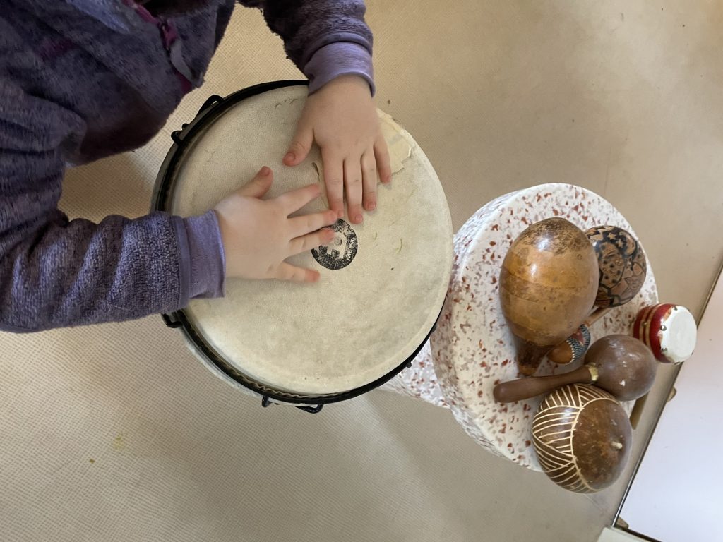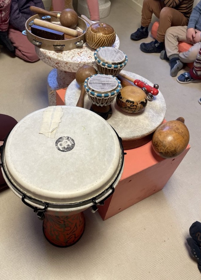 Mens pedagogene reflekterer, kommer det et forslag fra et barn: «Vi kan lage instrumenter!» Hun har nylig gjort seg erfaringer med instrumenter som hun syntes var spennende. Hvordan kan vi lage instrumenter? Hvordan kan vi gjenskape lyden av skyen vår ved hjelp av instrumenter?