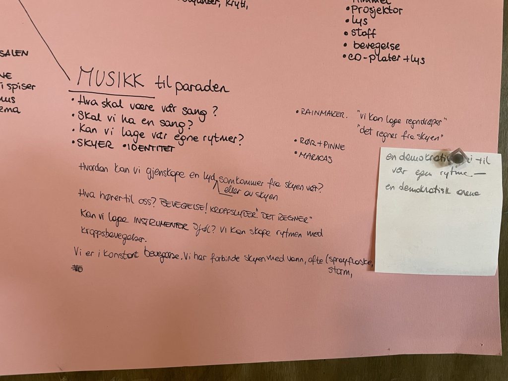 Hvilken sang skal vi gå i parade med? Pedagogene reflekterer: i år har vi ikke hatt en spesiell sang som vi forbinder med prosessen vår om skyen. I fjor hadde vi Kråkesangen eller Jordsangen. Det vi har lagt merke til i år, er at barna har skapt skyens lyd selv. De løfter armene opp og ned og sier «shh, shh».