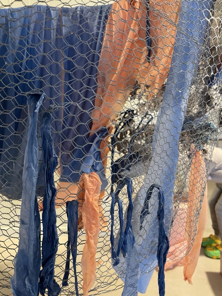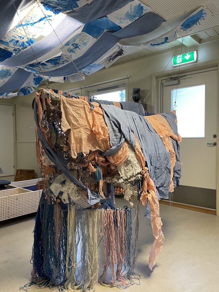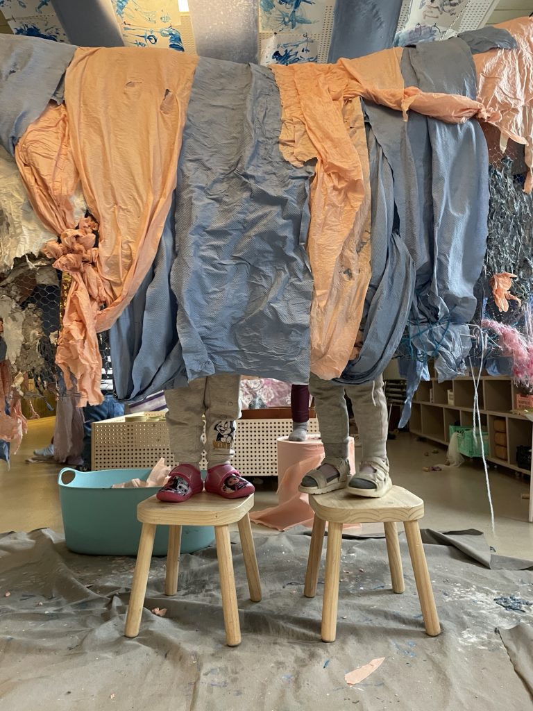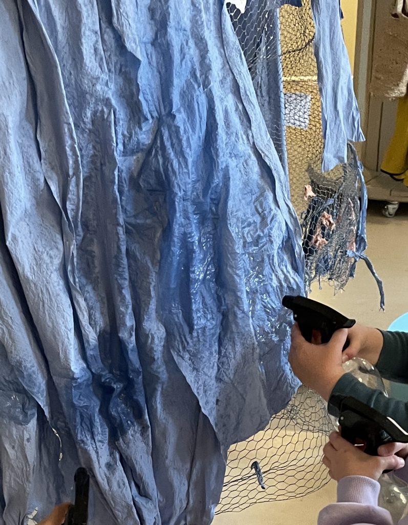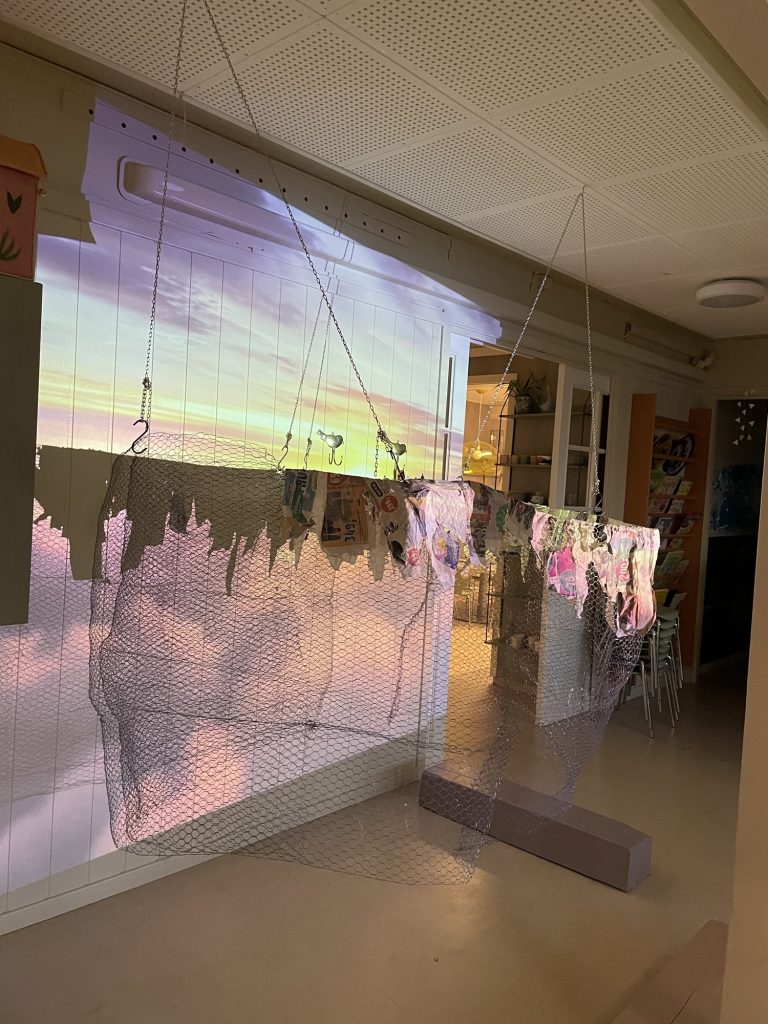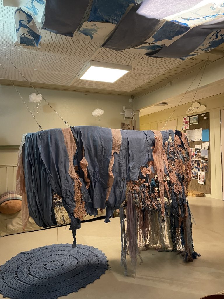 Dagen vi begynte å lage rukleskyen vår, var magisk! Barna og pedagogene jobbet sammen. Det var et felleskap av nysgjerrighet, samarbeid, og bevegelse. Barna stod rundt det som skulle bli vår ruklesky og sa i kor «opp og ned, opp og ned» mens alle beveget seg og holdt i skyen.