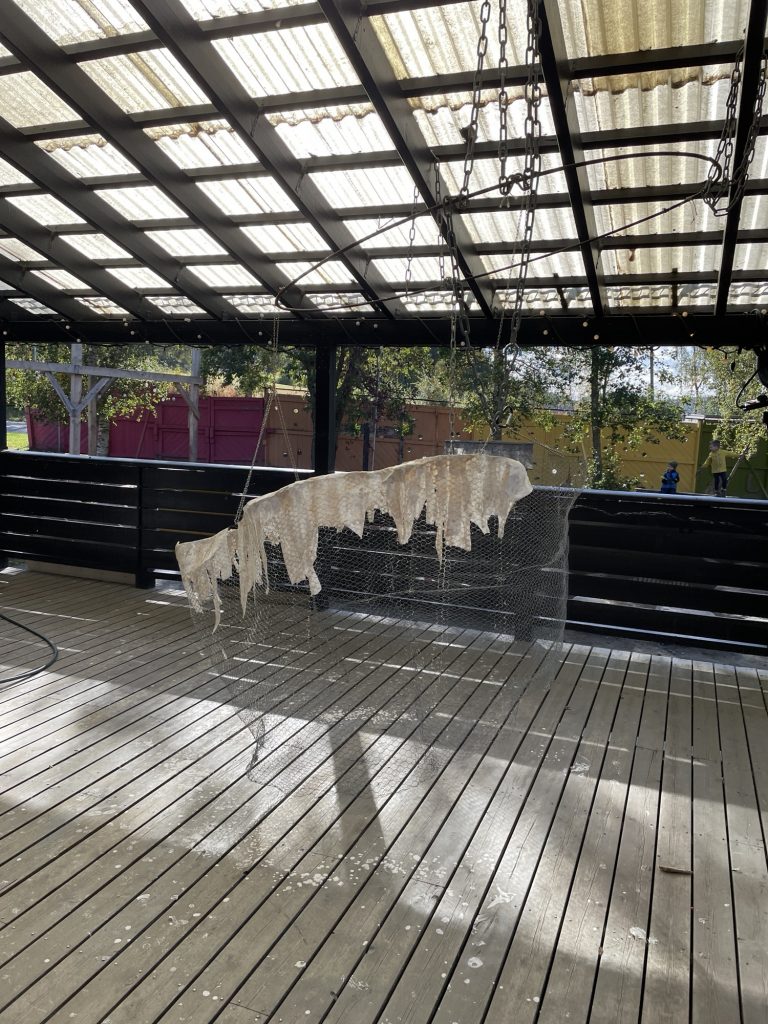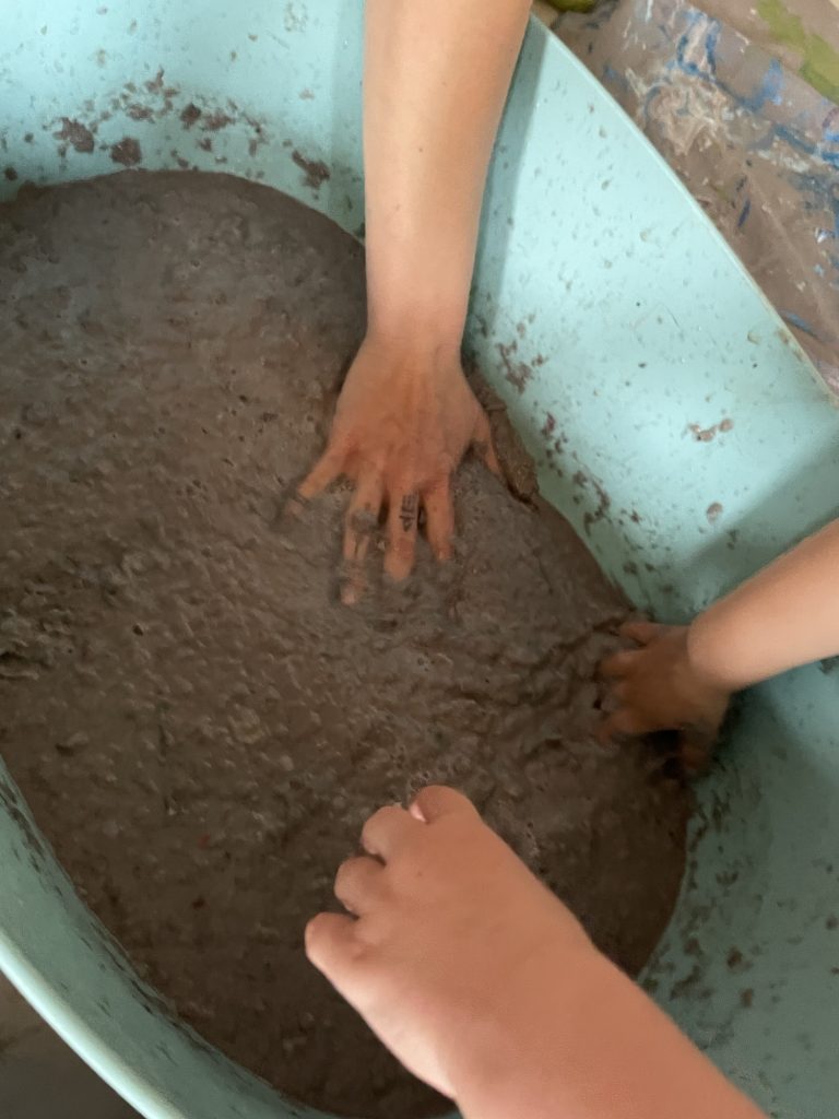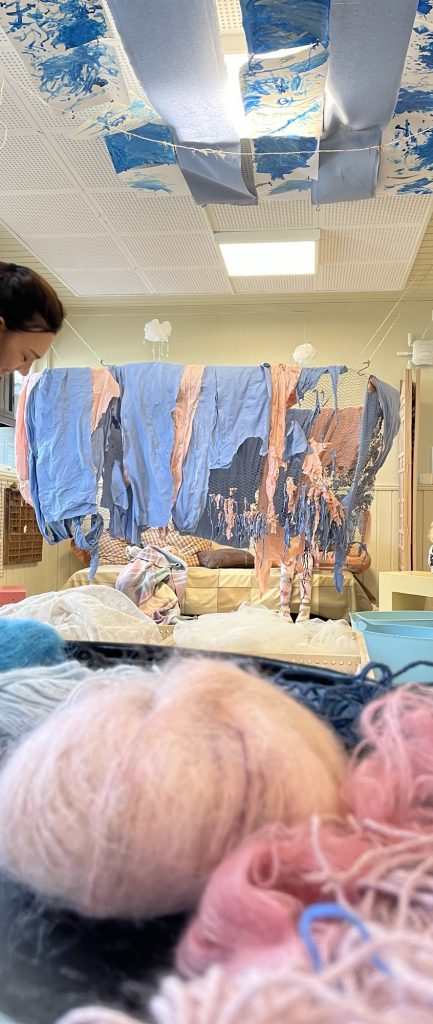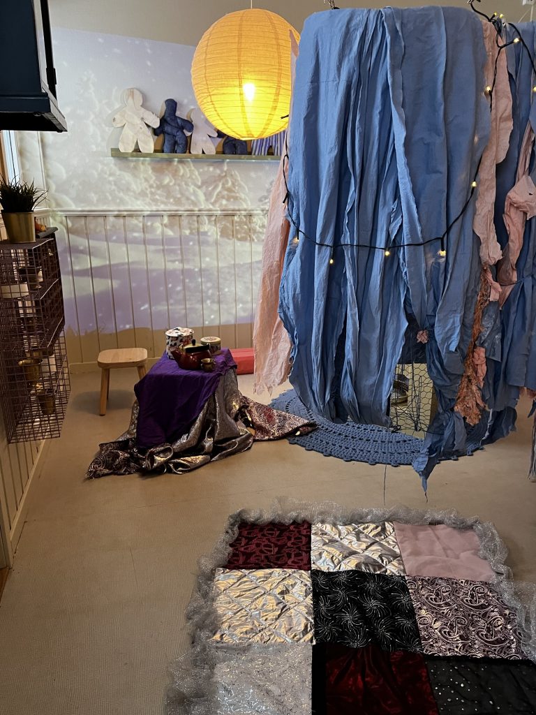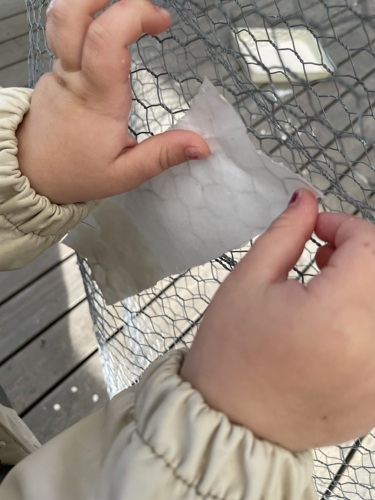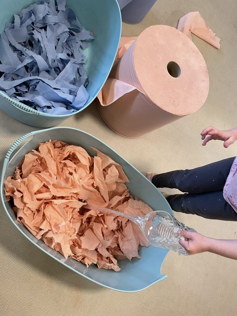 Dagen vi begynte å lage rukleskyen vår, var magisk! Barna og pedagogene jobbet sammen. Det var et felleskap av nysgjerrighet, samarbeid, og bevegelse. Barna stod rundt det som skulle bli vår ruklesky og sa i kor «opp og ned, opp og ned» mens alle beveget seg og holdt i skyen.