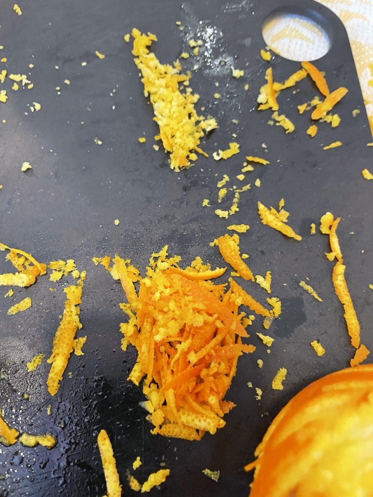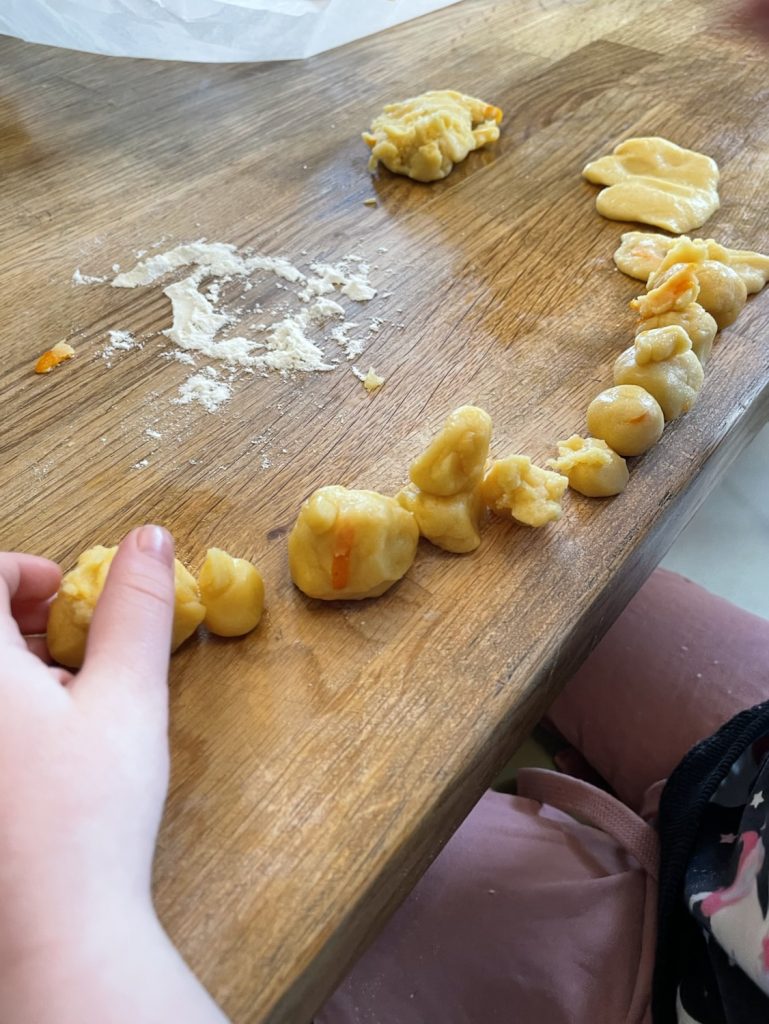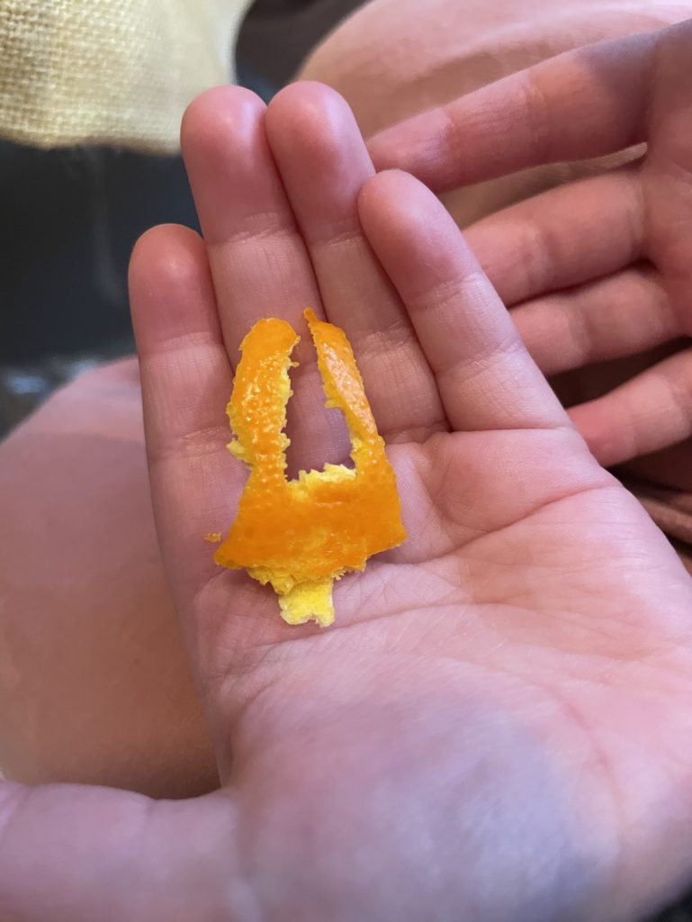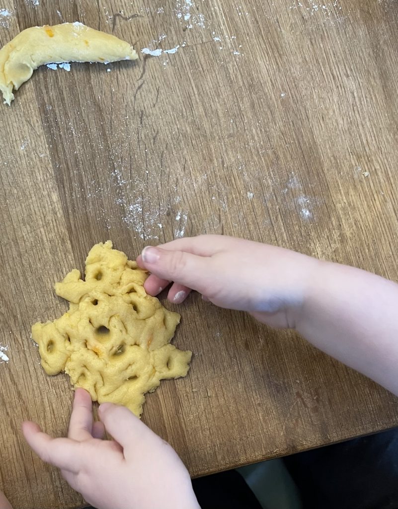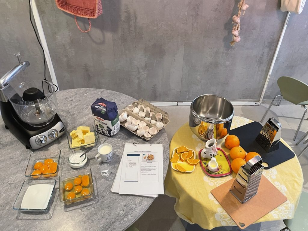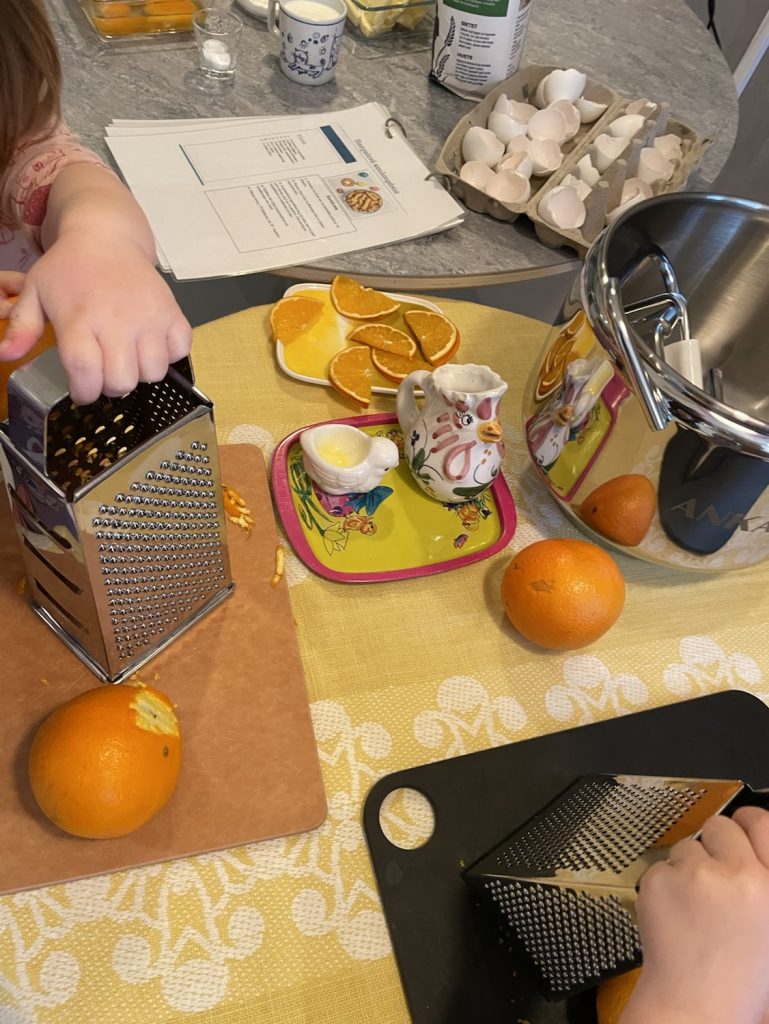 Bordet på kjøkkenet inviterer barna inn med vakre farger, ulike konsistenser og lukter. Barna undrer og kjenner på nysgjerrighet for den nye måte å bruker appelsin på. Sammen rasper de appelsinskall, blander ingrediensene og lage deigen som blir senere brukt til å forme ut kjeksene.