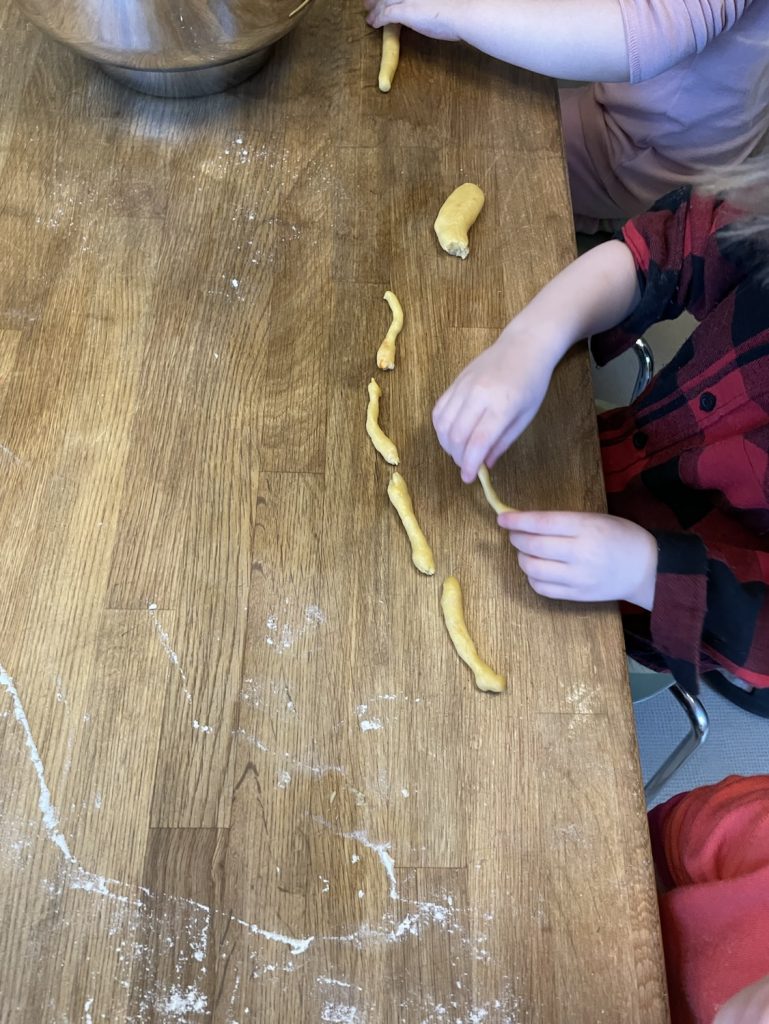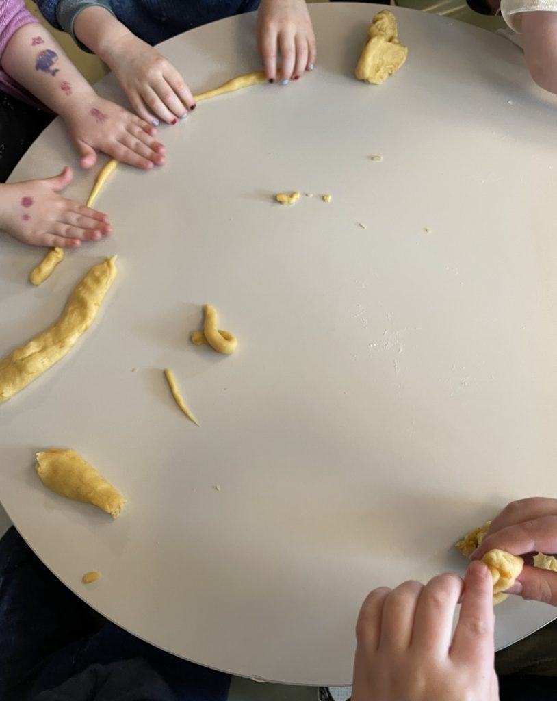 Alle Rukleskyan sitter rundt et langt bord og får utdelt litt deig hver. Barna tar inn sine fortellinger og sine mangfoldige mestring: «en slange med munn!», «jeg lager Rukleskyan», «en ring av gull», «det er som smultringer jeg lager med farmor». Vi kjenner oss begeistret når vi gjør.