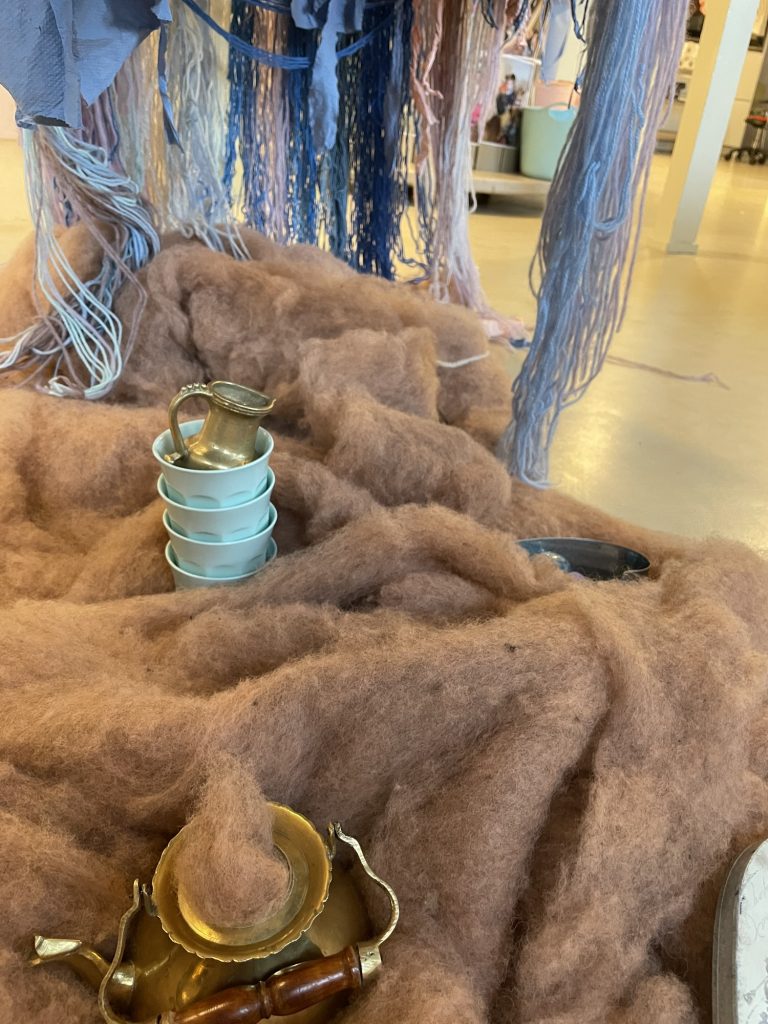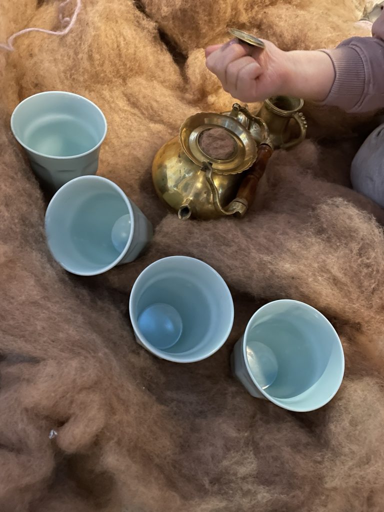 «Hva har du her?» spør pedagogen «det er kaffe for skyen.» forteller hun mens viser noe ulldotter som er inn i tekannen.