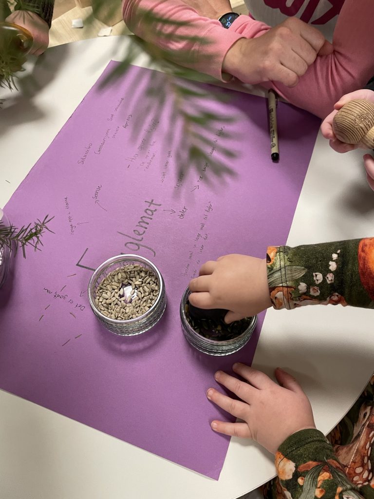 Videre er verksted- rommet dekket med pappkopper, defia fett, tråd og saks. På en gull fat er det lagt allerede noen frø.