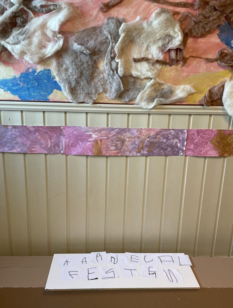 For å telle ned til den store dagen til prosessen vår, har pedagogene funnet en måte som er tilpasset det barna er opptatt av: en bokstavkalender. Hver dag samler vi oss mellom skybildet og skyen vår og henger opp en bokstav på en plakat vi sammen har malet. Fjorten dager igjen til festen, fjorten bokstaver å henge fram til vi skal lese «KARNEVALFESTEN».