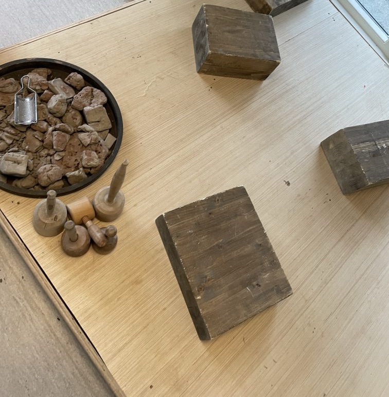 Denne gangen ønsket vi å utforske leiren på en annen måte enn vi pleier. I stedet for å starte med myk og formbar masse, dekket vi verkstedet med tørr, hard leire. Allerede før vi begynte å arbeide, hadde rommet fått en annen karakter – mer rått, mer fysisk.