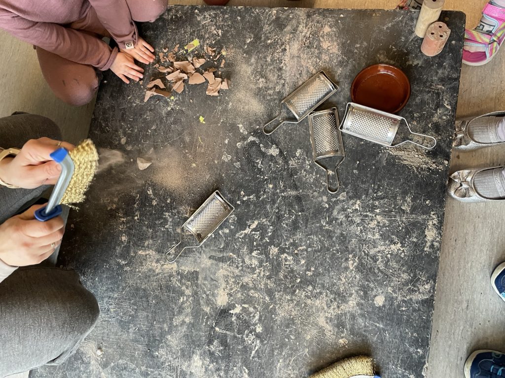 Ved raspestasjonen endret tempoet seg. Bevegelsene ble mer kontrollerte, nesten meditative. Overflaten ble bearbeidet gradvis. Støv og små partikler samlet seg. Her handlet det om tålmodighet, om å kjenne hvordan strukturen endret seg under hendene.
