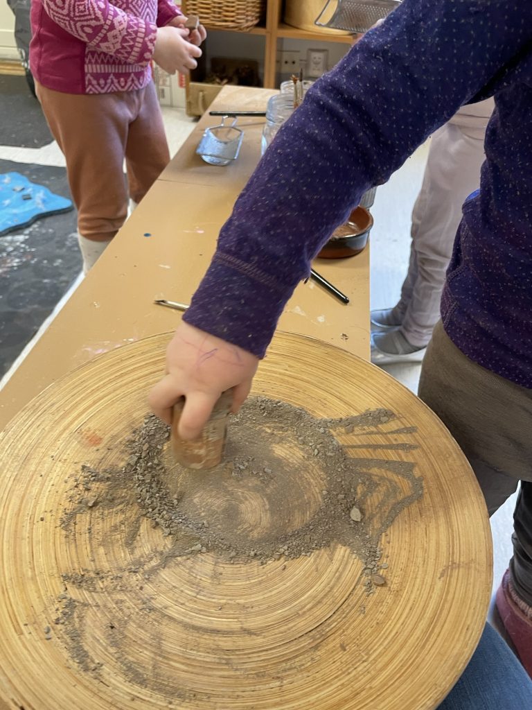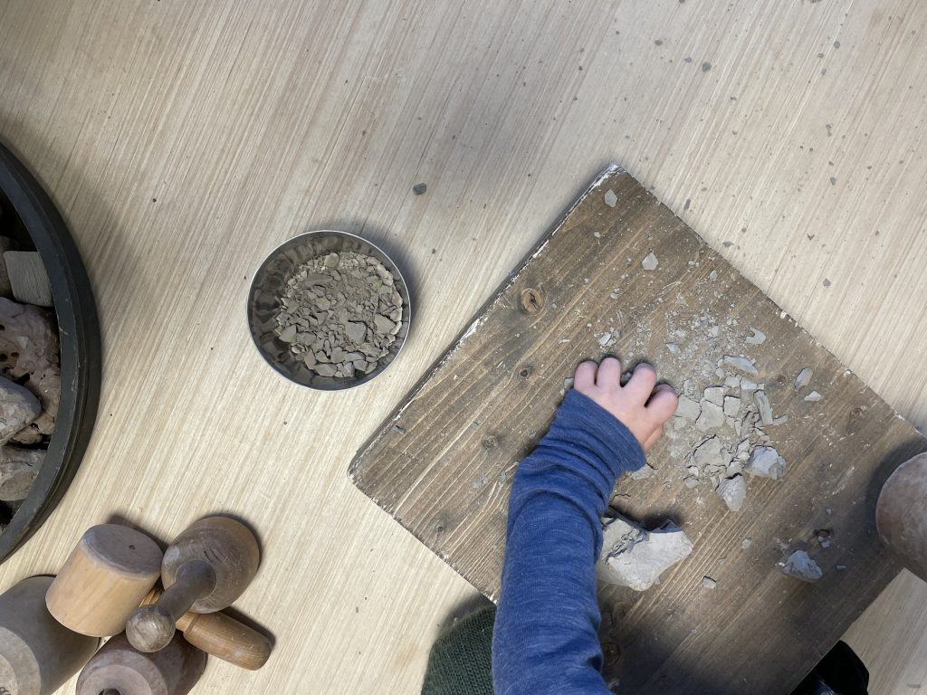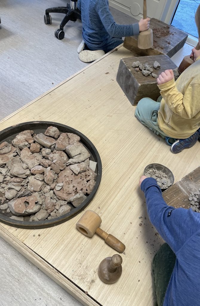 Ved knuse- og bankestasjonen startet det hele med kraft. Lyden av leire som ble slått i stykker fylte rommet. Det var intenst, nesten rytmisk. Kroppen måtte kobles på. Armene jobbet, skuldrene jobbet. Den harde leiren ga motstand, og vi måtte bruke tyngde og presisjon. Det var noe frigjørende i å bryte ned materialet – å gå løs på det uten å skulle skape noe “pent” med en gang.
