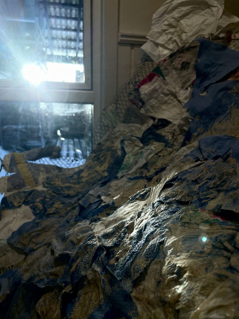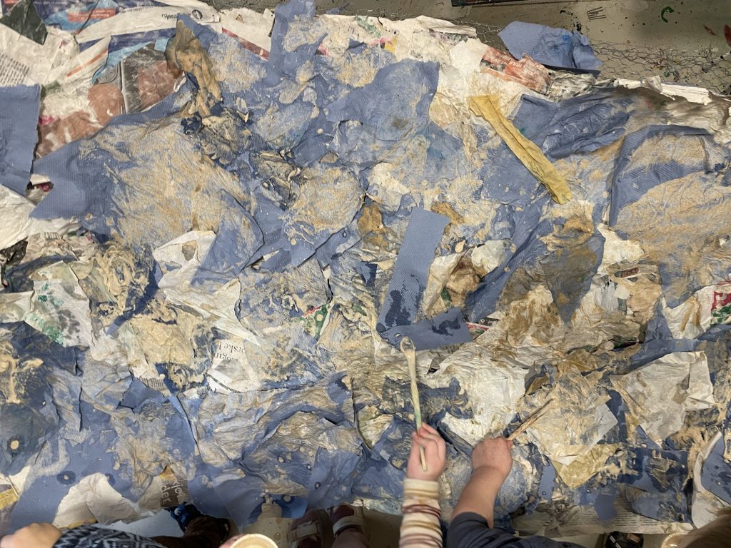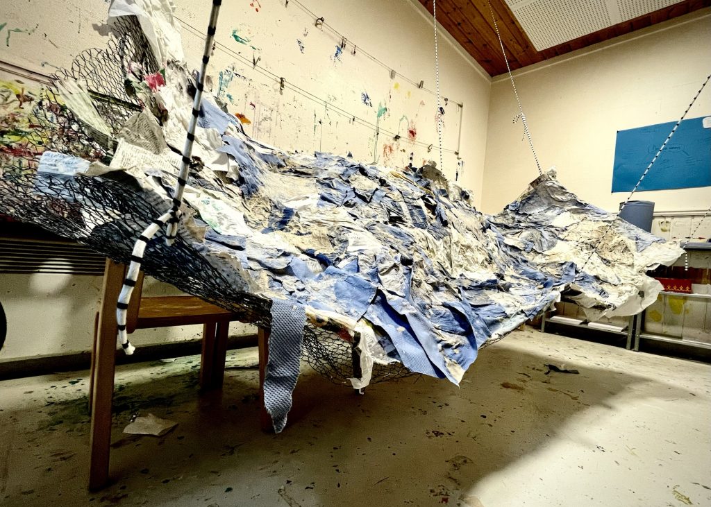 Formiddagsøkt med den store slørskya. I starten var rommet fylt med barn og ivrige stemmer, men nå står bare to igjen og jobber konsentrert. Fra den ene jenta kommer det spontant en sang:
