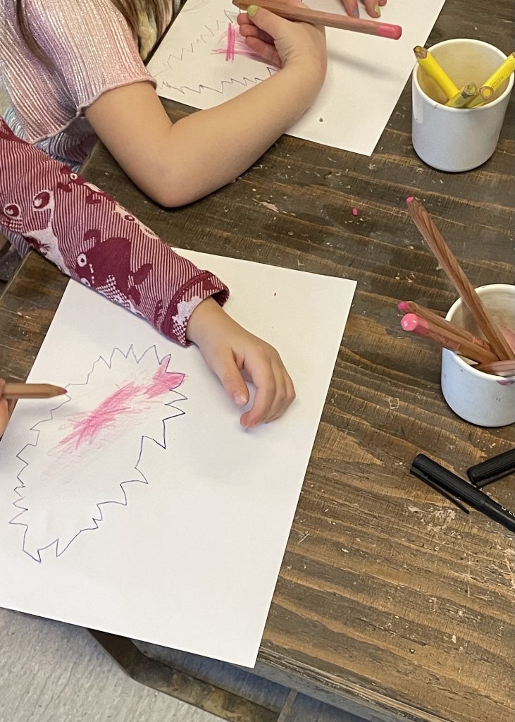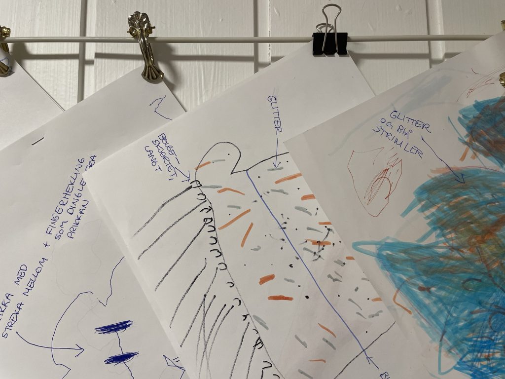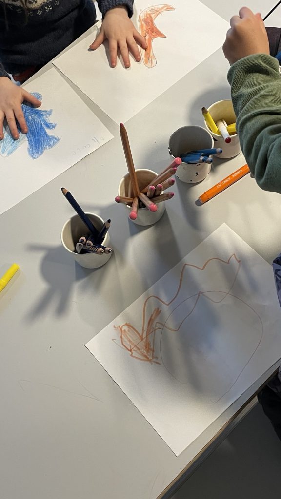 Vi jobber i små puljer slik at vi voksne får notert tankene og ideene som kommer fra barna mens de tegner: