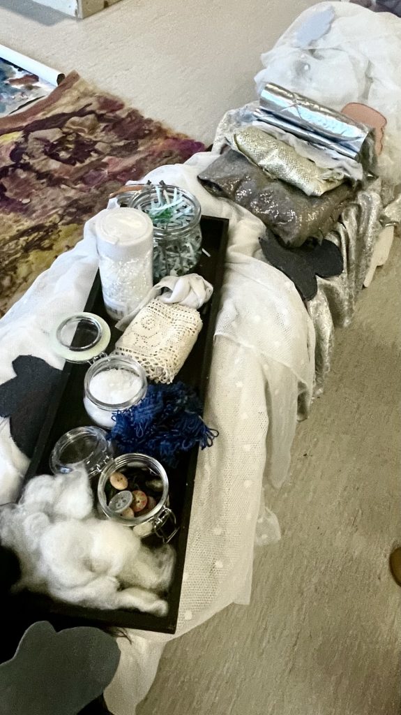 På verkstedet er det dekket på med tegneark, blyant og materialer til inspirasjon: stoffer, papp, garn, bånd, glitter og små filtskyer. Et stykke tyll er drapert på en kleshenger, og en stor sky er klippet ut i papp for å visualisere at det vi tegner på arket blir til noe vi kan ha på kroppen. Vi bruker oss selv som mannekenger for å skape forbindelse mellom arbeidstegningene og materialene som blir kostymene.