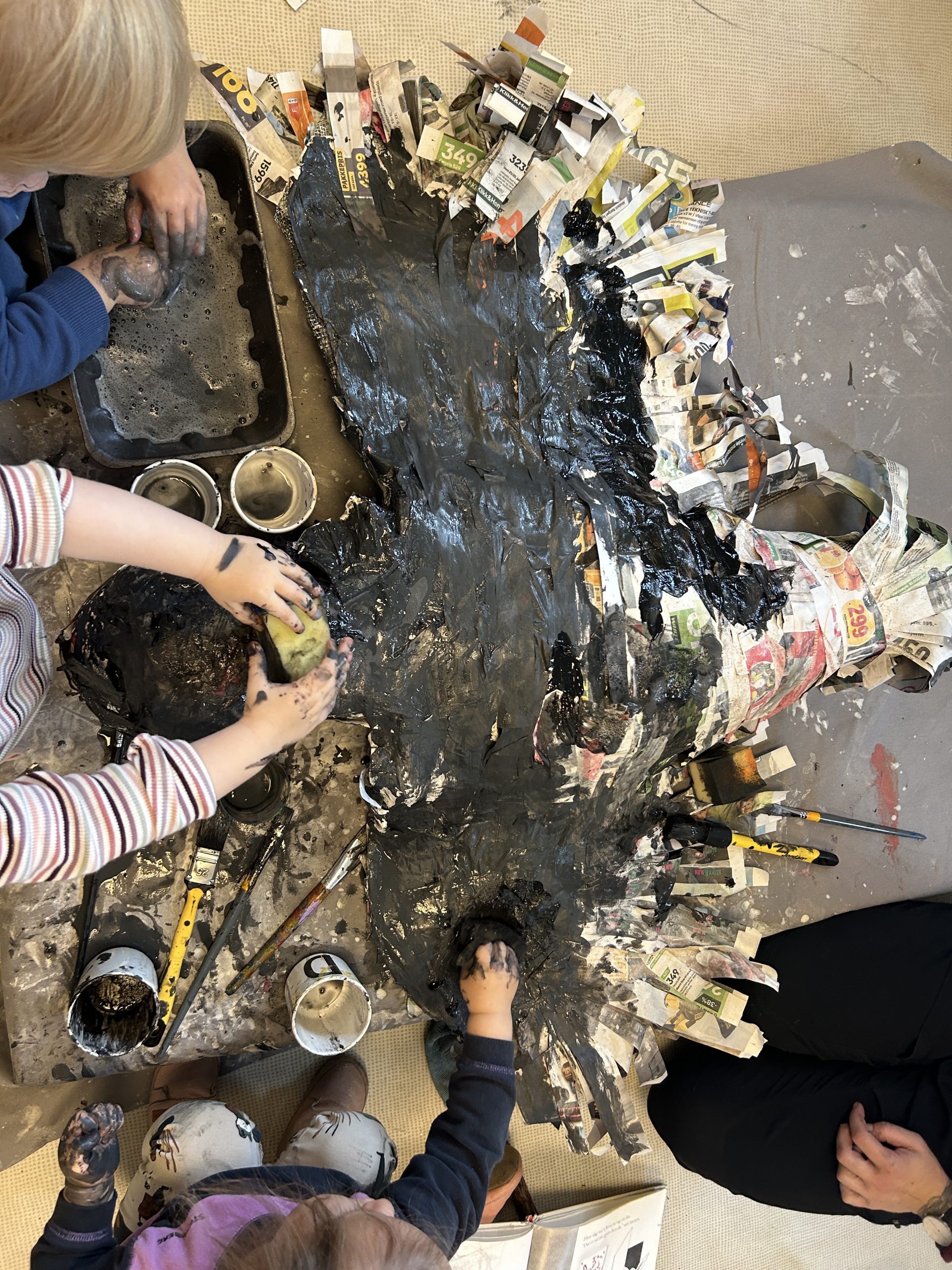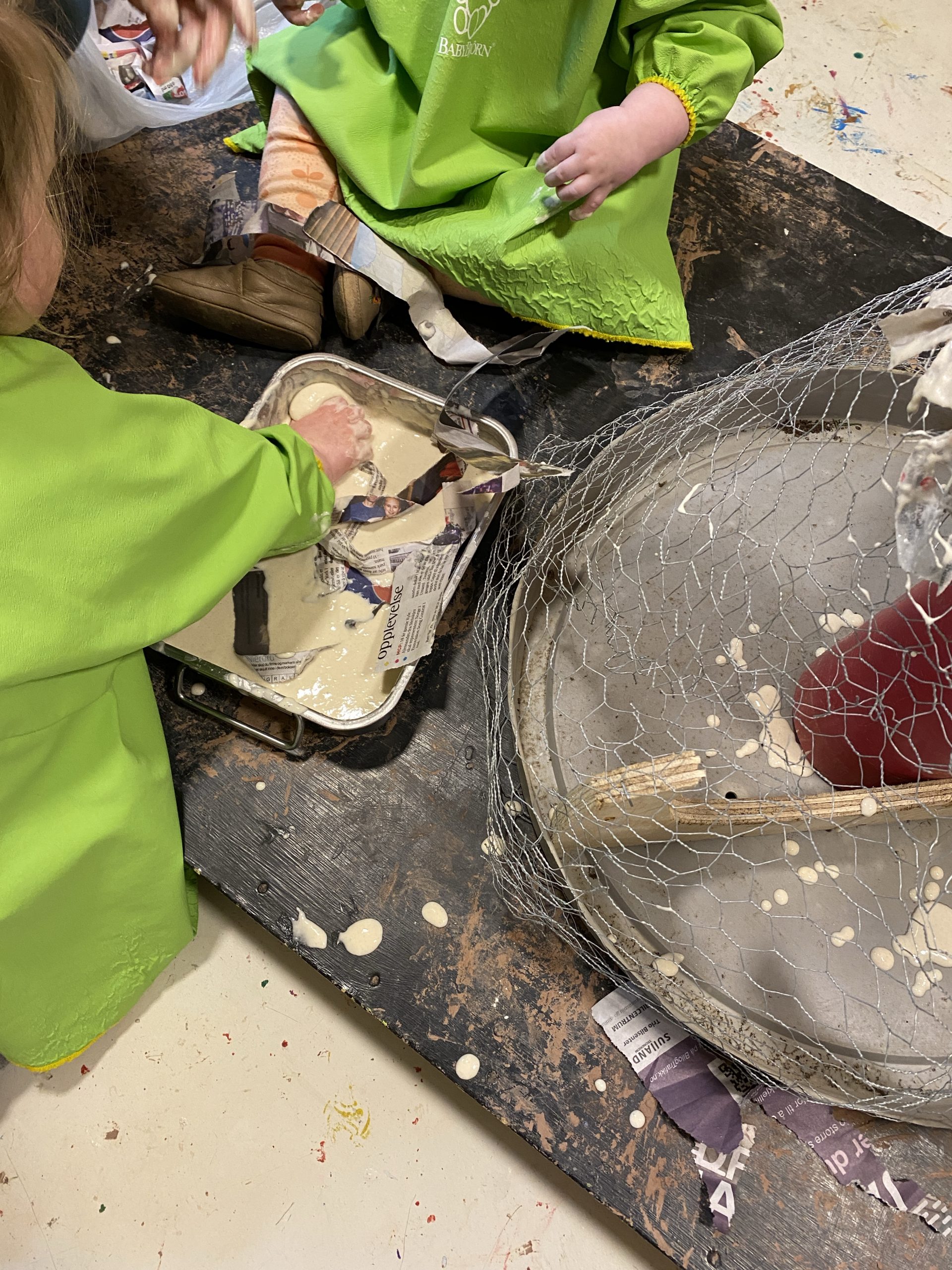 Små hender blir kjent med nye metoder for å skape. Det kjente: malefrakk og pensel. Det nye / utforskende: avispapir, vann blandet med mel (limet). Selve konstruksjonen av hønsenetting med støtte i et papprør. «Male, male!» utrykker et barn ivrig når han ser at malefrakkene kommer frem. Etter en stund i aktiviteten fyller han på […]