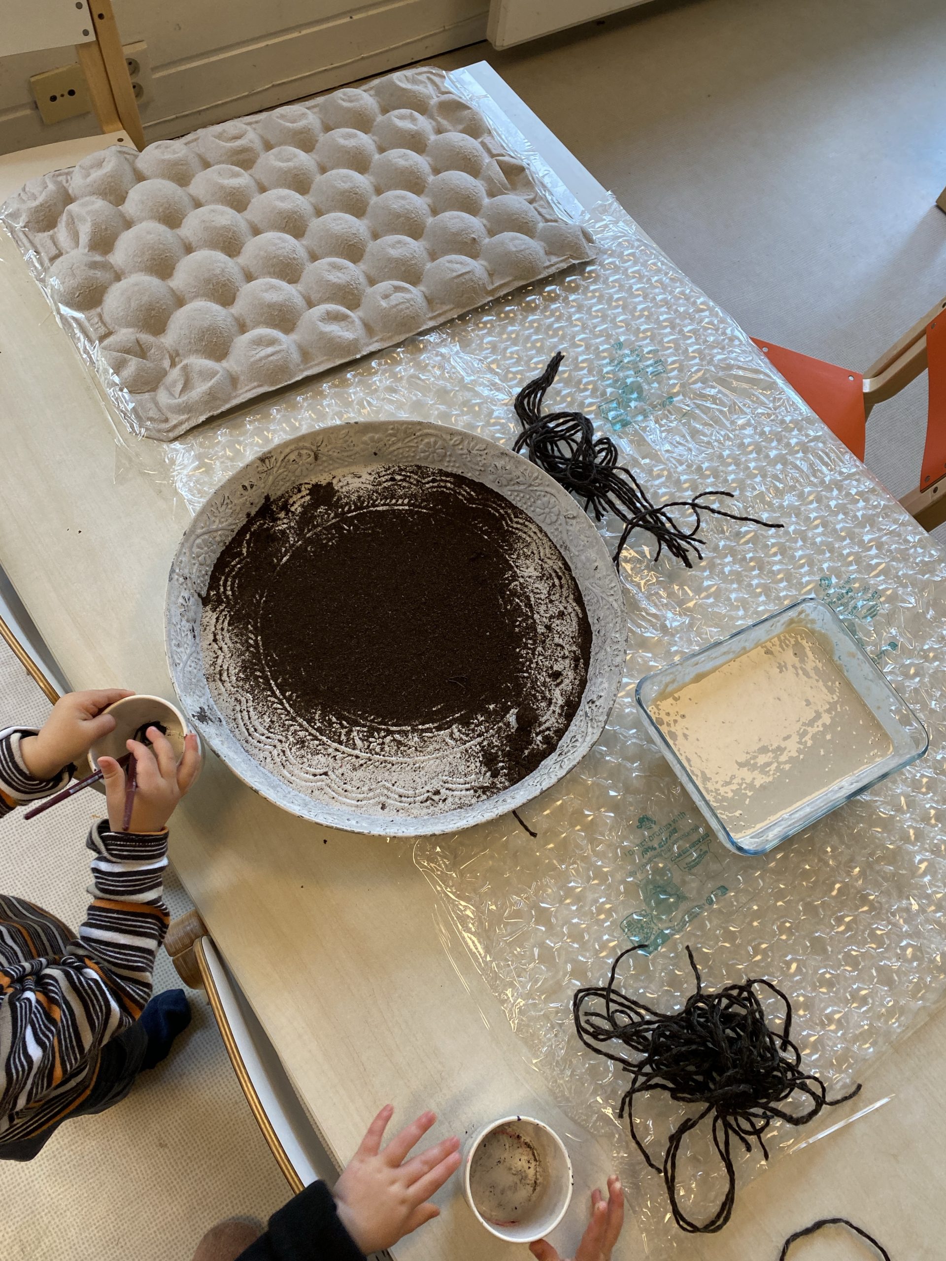 Ramma vår er fylt opp med jord, garn og lim. I helga har den stått til tørk ute. Idag var det tid for å henge opp det vi har laget, og vise det frem til familiene og nabolaget. Den tørkede versjonen var ikke klissete lenger, og kjennes helt annerledes ut. Ettåringenes uttrykk er minst like […]
