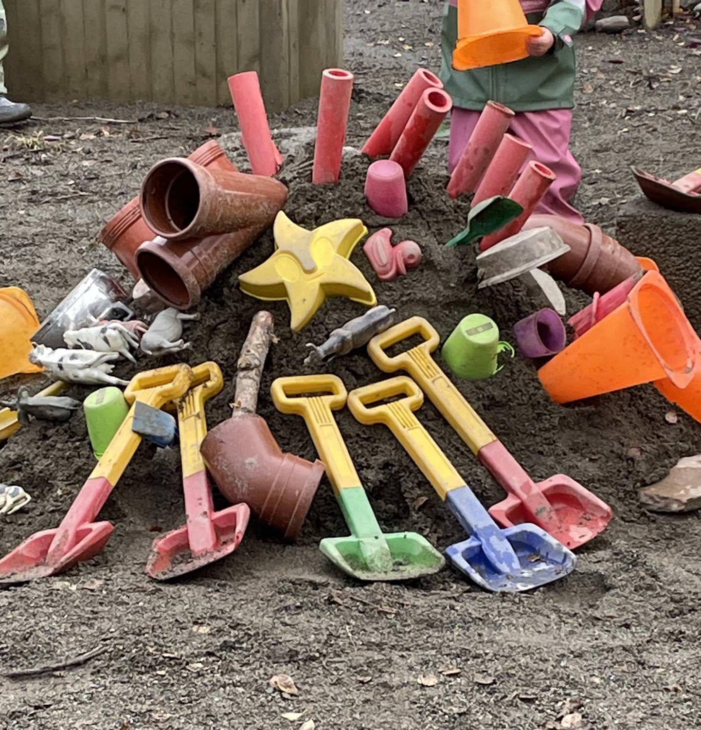 Vi møter uterommet på nytt nå som været og iscenesettelsen gir oss forandring. Nytt material i fargerik plast og masse vann gir mange ideer. Vi tramper i, springer i, samler oppi og tømmer ut vann. Vi trommer på plastkasser, kaster og samler lokk av plast. Vi kjenner og smaker.